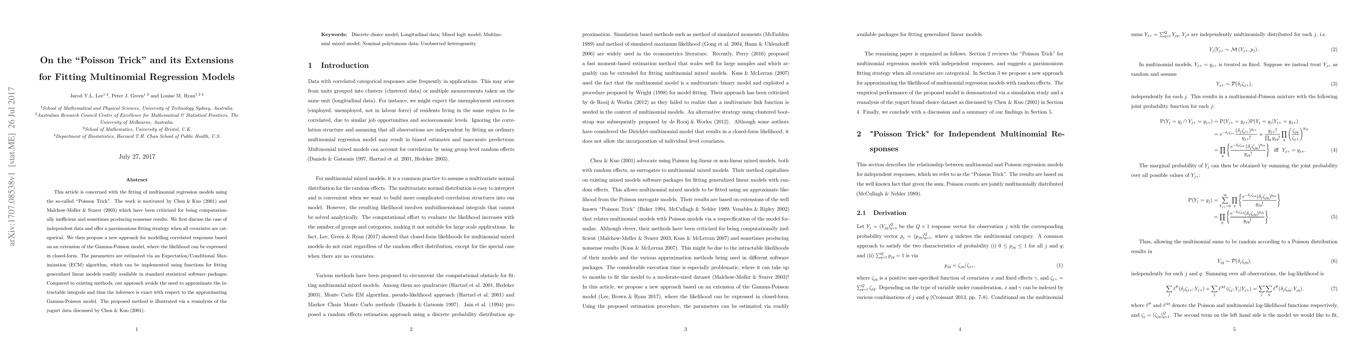 This paper proposes a new method for fitting multinomial regression models using an extended Gamma-Poisson model, avoiding computationally inefficient approximations and providing exact inference. The approach employs an Expectation/Conditional Maximization algorithm for parameter estimation, demonstrated through a reanalysis of the yogurt data.