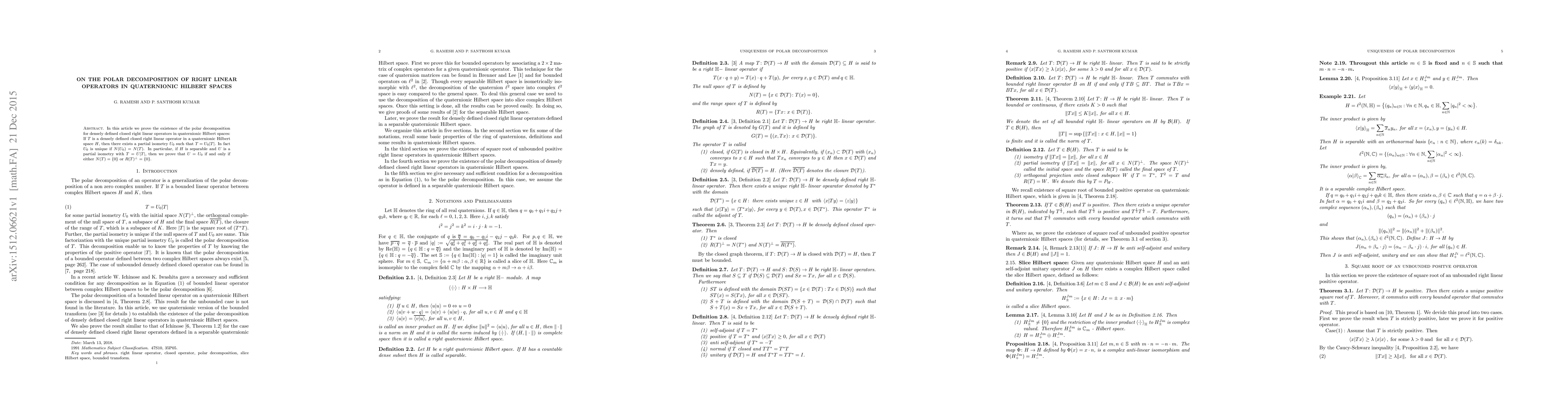 This paper proves the existence and uniqueness of the polar decomposition for densely defined closed right linear operators in quaternionic Hilbert spaces, showing that $T = U_{0}|T|$ with $U_{0}$ being unique under certain conditions, and establishing that $U = U_{0}$ if $N(T) = \{0\}$ or $R(T)^{\bot} = \{0\}$.