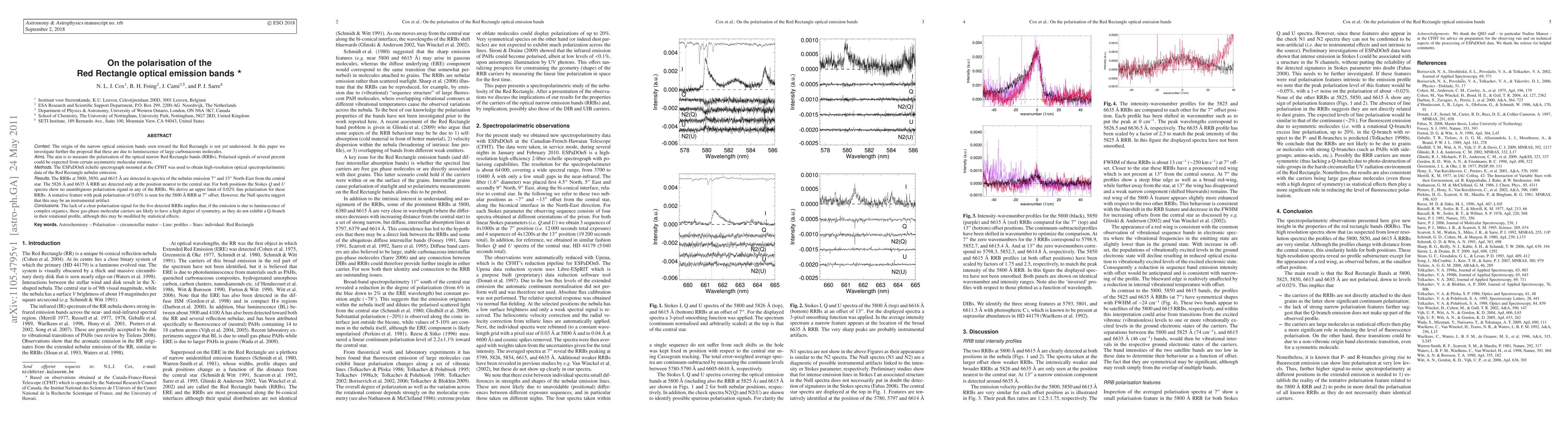 The Red Rectangle nebula's optical emission bands show no clear polarisation signal, suggesting complex organic molecules may not exhibit asymmetry, contradicting a proposed explanation for the phenomenon.