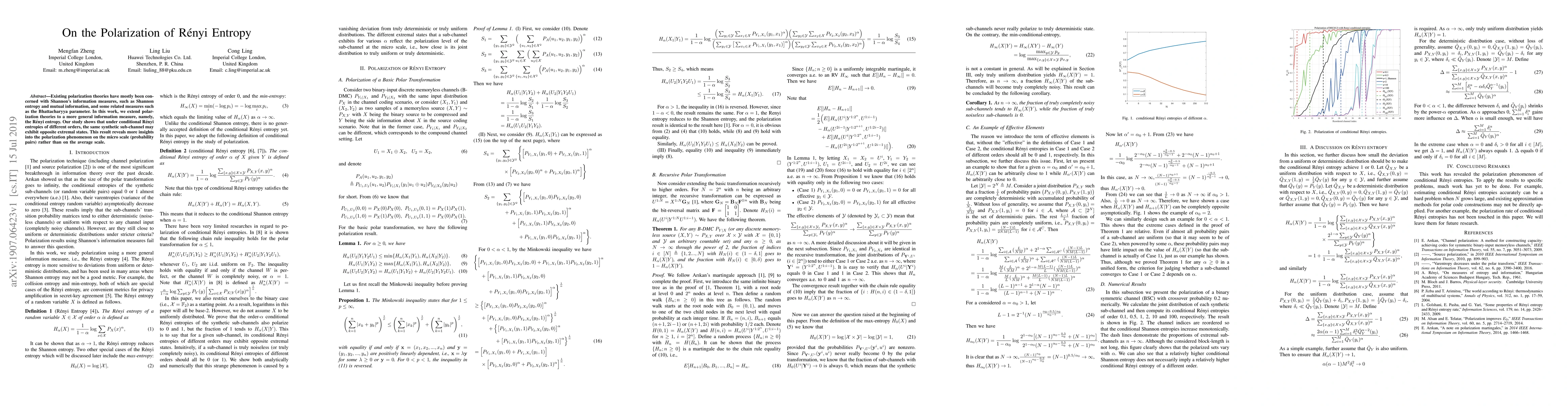 This paper extends polarization theories to Rényi entropy, demonstrating that different orders of conditional Rényi entropies can lead to opposite extremal states through a synthetic sub-channel, providing deeper insights into the polarization phenomenon at the micro scale of probability pairs.