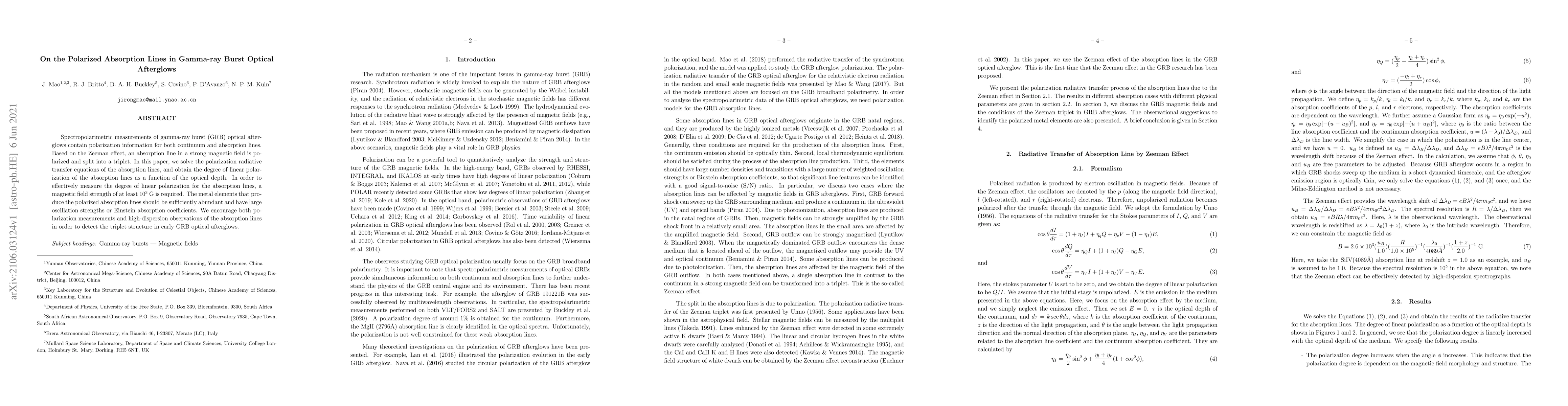 Spectropolarimetric measurements of gamma-ray burst (GRB) optical afterglows contain polarization information for both continuum and absorption lines. Based on the Zeeman effect, an absorption line in a strong magnetic field is polarized and split into a triplet. In this paper, we solve the polarization radiative transfer equations of the absorption lines, and obtain the degree of linear polarization of the absorption lines as a function of the optical depth. In order to effectively measure the degree of linear polarization for the absorption lines, a magnetic field strength of at least $10^3$ G is required. The metal elements that produce the polarized absorption lines should be sufficiently abundant and have large oscillation strengths or Einstein absorption coefficients. We encourage both polarization measurements and high-dispersion observations of the absorption lines in order to detect the triplet structure in early GRB optical afterglows.