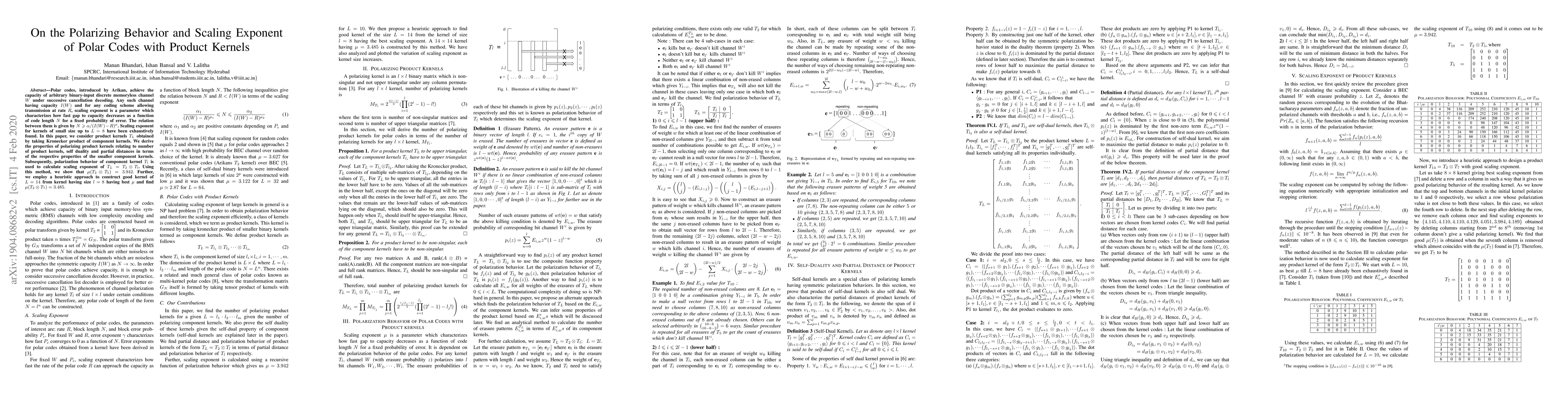 Polar codes, introduced by Arikan, achieve the capacity of arbitrary binary-input discrete memoryless channel $W$ under successive cancellation decoding. Any such channel having capacity $I(W)$ and for any coding scheme allowing transmission at rate $R$, scaling exponent is a parameter which characterizes how fast gap to capacity decreases as a function of code length $N$ for a fixed probability of error. The relation between them is given by $N\geqslant \alpha/(I(W)-R)^\mu$. Scaling exponent for kernels of small size up to $L=8$ have been exhaustively found. In this paper, we consider product kernels $T_{L}$ obtained by taking Kronecker product of component kernels. We derive the properties of polarizing product kernels relating to number of product kernels, self duality and partial distances in terms of the respective properties of the smaller component kernels. Subsequently, polarization behavior of component kernel $T_{l}$ is used to calculate scaling exponent of $T_{L}=T_{2}\otimes T_{l}$. Using this method, we show that $\mu(T_{2}\otimes T_{5})=3.942.$ Further, we employ a heuristic approach to construct good kernel of $L=14$ from kernel having size $l=8$ having best $\mu$ and find $\mu(T_{2}\otimes T_{7})=3.485.$
