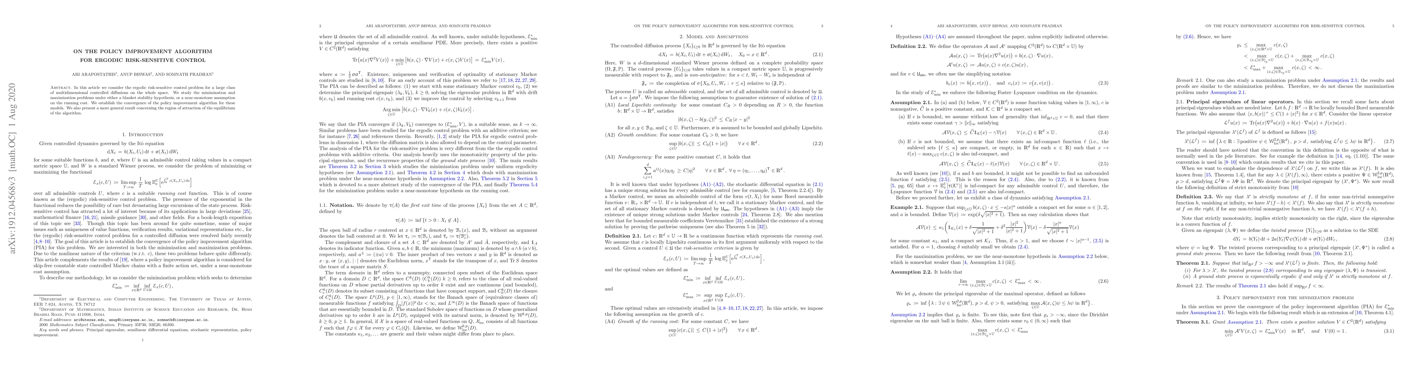 This paper investigates the ergodic risk-sensitive control problem for multidimensional controlled diffusions, establishing the convergence of the policy improvement algorithm under stability hypotheses or near-monotonicity assumptions, and presenting a broader result on the algorithm's region of attraction.