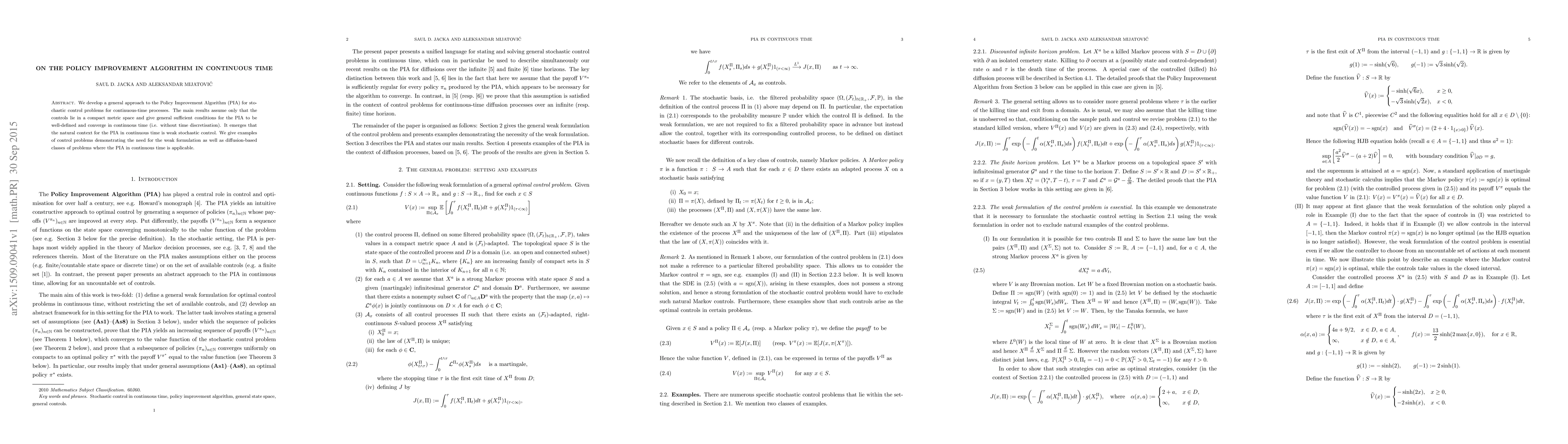 This paper develops a general Policy Improvement Algorithm for continuous-time stochastic control problems, providing sufficient conditions for its convergence without time discretization. It highlights the relevance of weak stochastic control and illustrates its applicability through specific control problem examples.
