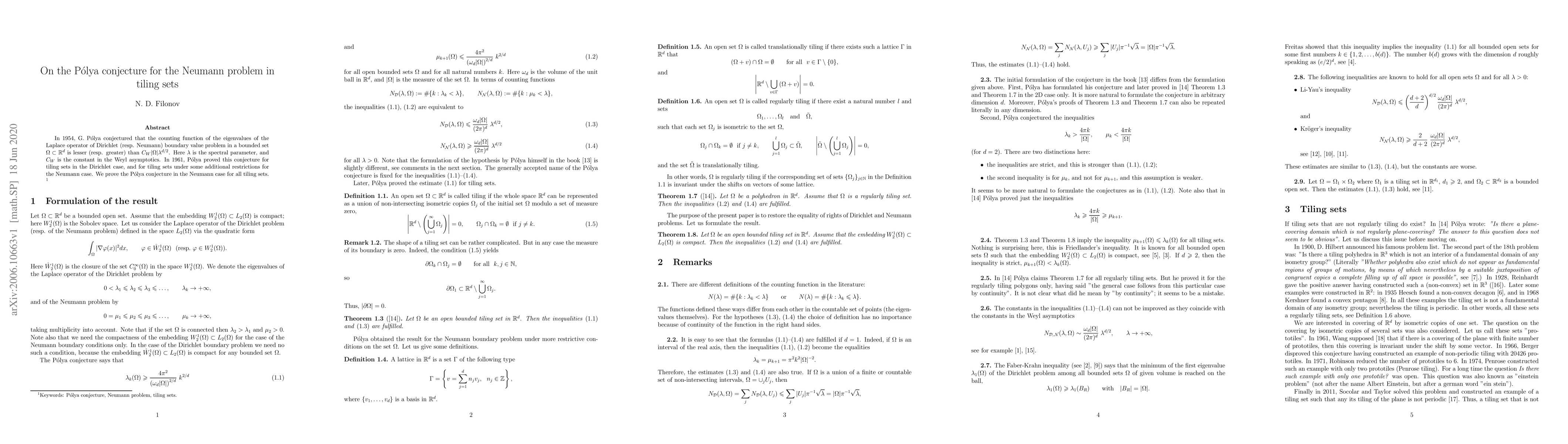 In 1954, G. P\'olya conjectured that the counting function of the eigenvalues of the Laplace operator of Dirichlet (resp. Neumann) boundary value problem in a bounded set $\Omega\subset{\mathbb R}^d$ is lesser (resp. greater) than $C_W |\Omega| \lambda^{d/2}$. Here $\lambda$ is the spectral parameter, and $C_W$ is the constant in the Weyl asymptotics. In 1961, P\'olya proved this conjecture for tiling sets in the Dirichlet case, and for tiling sets under some additional restrictions for the Neumann case. We prove the P\'olya conjecture in the Neumann case for all tiling sets.