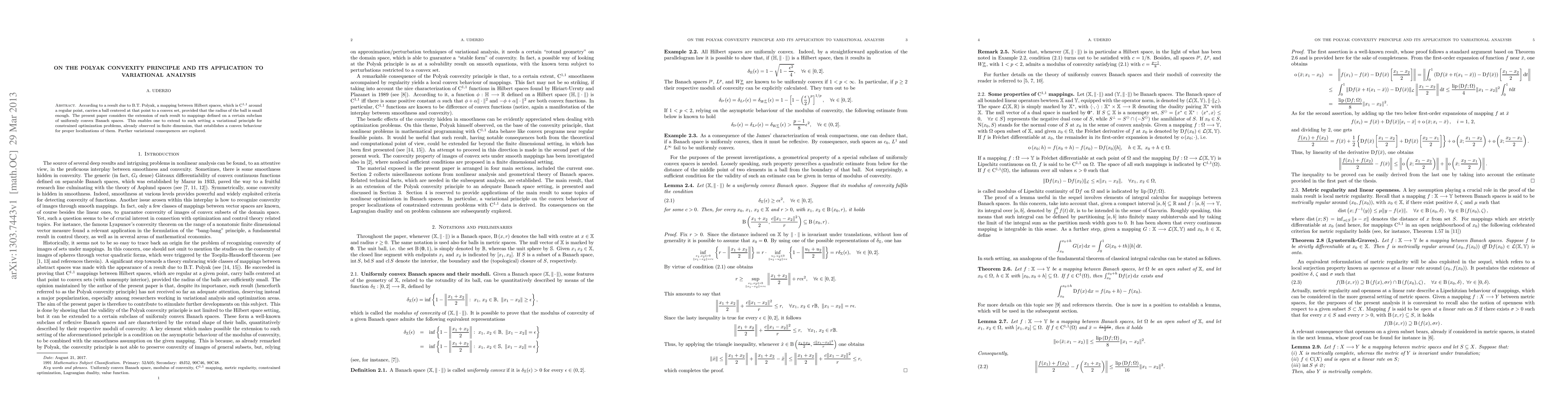 The paper extends Polyak's convexity principle to uniformly convex Banach spaces, enabling a variational analysis for constrained optimization problems in such settings.