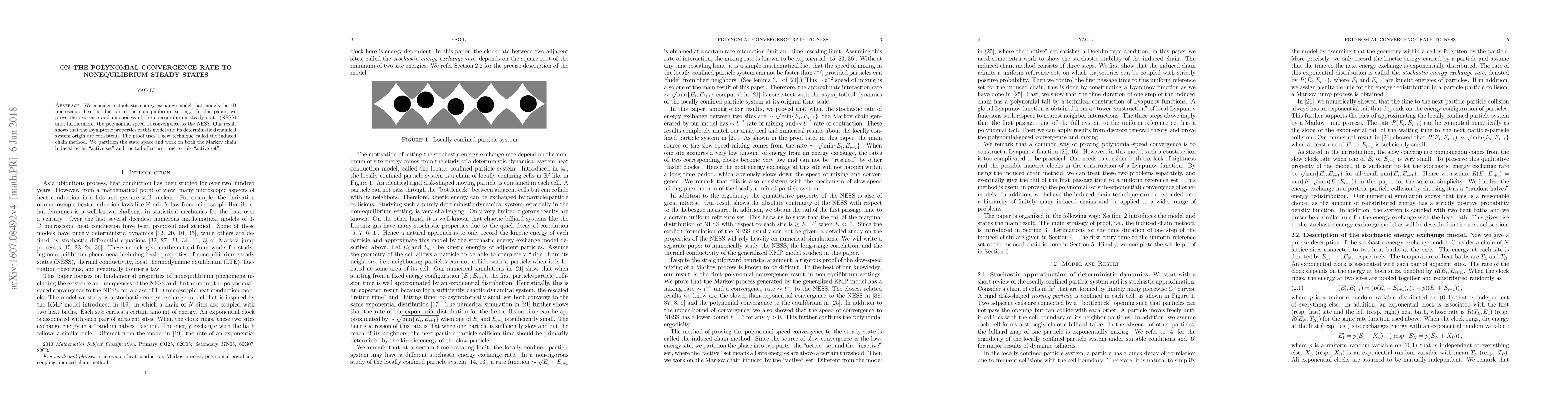 We consider a stochastic energy exchange model that models the 1D microscopic heat conduction in the nonequilibrium setting. In this paper, we prove the existence and uniqueness of the nonequilibrium steady state (NESS) and, furthermore, the polynomial speed of convergence to the NESS. Our result shows that the asymptotic properties of this model and its deterministic dynamical system origin are consistent. The proof uses a new technique called the induced chain method. We partition the state space and work on both the Markov chain induced by an "active set" and the tail of return time to this "active set".