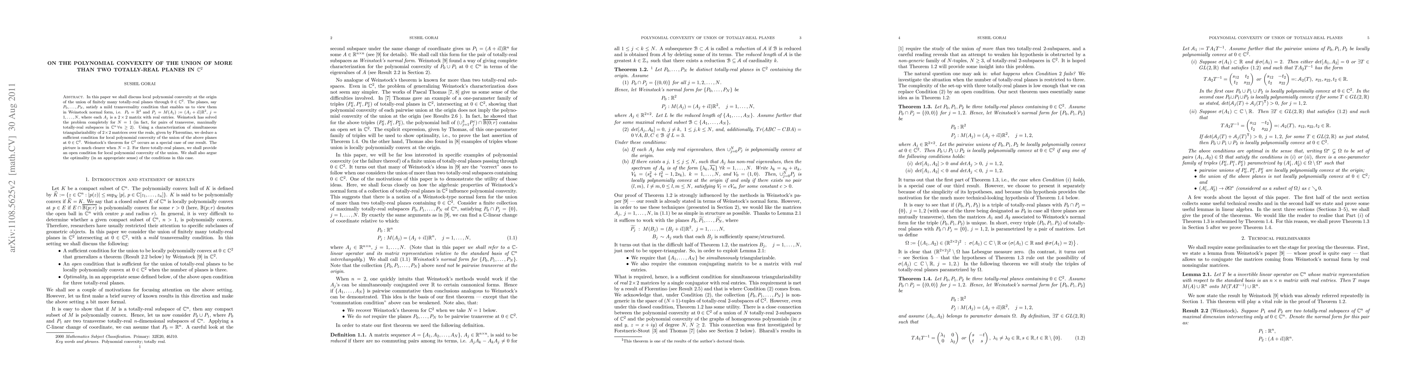 In this paper we shall discuss local polynomial convexity at the origin of the union of finitely many totally-real planes through $0 \in\mathbb{C}^2$. The planes, say $P_0,..., P_N$, satisfy a mild transversality condition that enables us to view them in Weinstock normal form, i.e. $P_0=\mathbb{R}^2$ and $P_j=M(A_j):=(A_j+i\mathbb{I})\mathbb{R}^2$, $j=1,...,N$, where each $A_j$ is a $2\times 2$ matrix with real entries. Weinstock has solved the problem completely for N=1 (in fact, for pairs of transverse, maximally totally-real subspaces in $\mathbb{C}^n\, \forall n\geq 2$). Using a characterization of simultaneous triangularizability of $2\times 2$ matrices over the reals, given by Florentino, we deduce a sufficient condition for local polynomial convexity of the union of the above planes at $0\in \mathbb{C}^2$. Weinstock's theorem for $\mathbb{C}^2$ occurs as a special case of our result. The picture is much clearer when N=2. For three totally-real planes, we shall provide an open condition for local polynomial convexity of the union. We shall also argue the optimality (in an appropriate sense) of the conditions in this case.