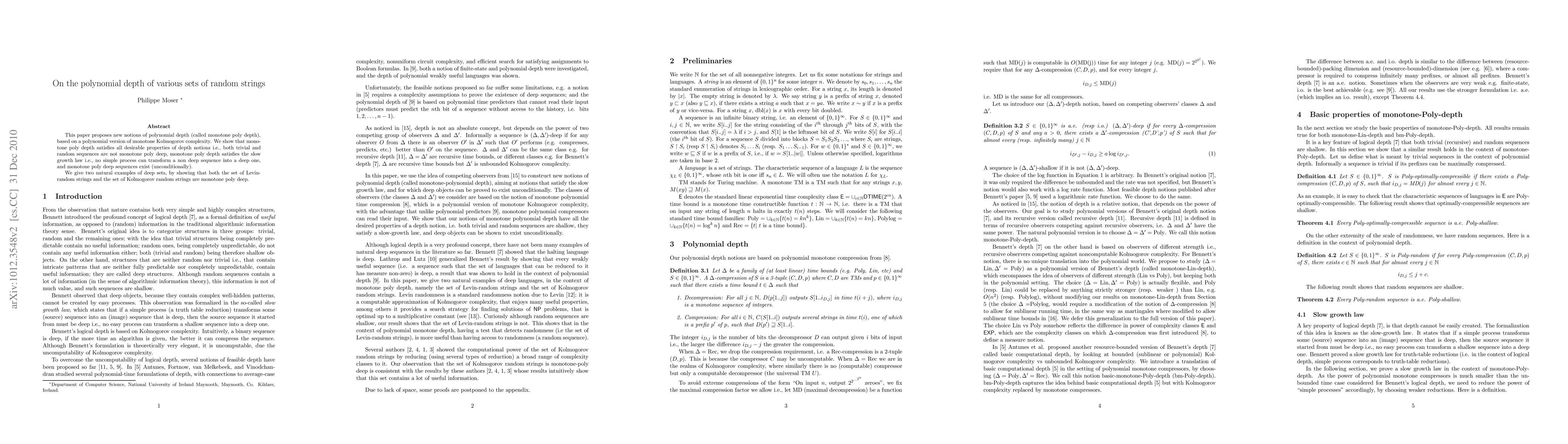 This paper proposes new notions of polynomial depth (called monotone poly depth), based on a polynomial version of monotone Kolmogorov complexity. We show that monotone poly depth satisfies all desirable properties of depth notions i.e., both trivial and random sequences are not monotone poly deep, monotone poly depth satisfies the slow growth law i.e., no simple process can transform a non deep sequence into a deep one, and monotone poly deep sequences exist (unconditionally). We give two natural examples of deep sets, by showing that both the set of Levin-random strings and the set of Kolmogorov random strings are monotone poly deep.