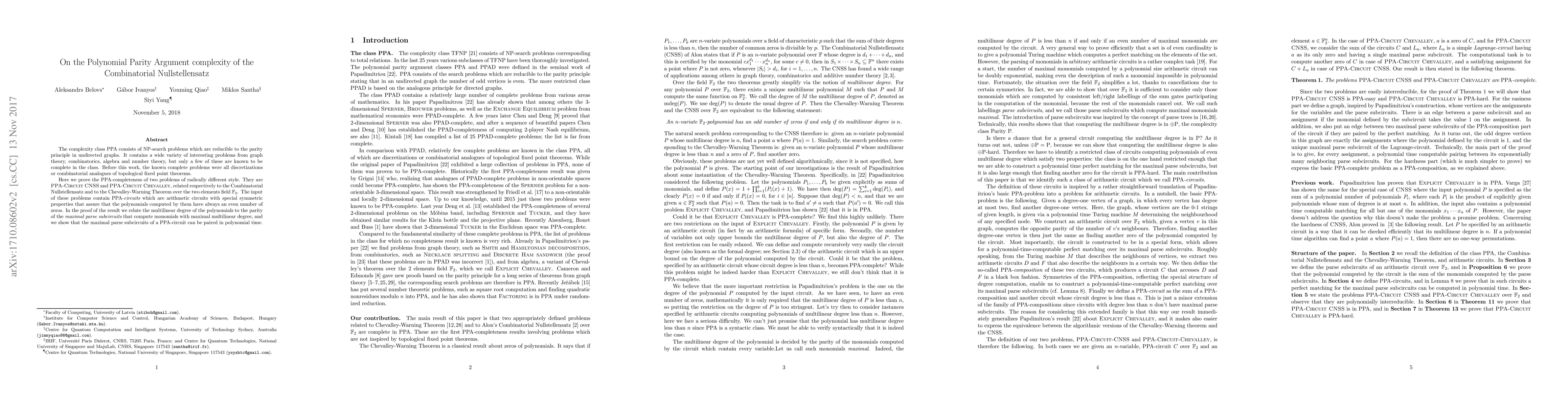The complexity class PPA consists of NP-search problems which are reducible to the parity principle in undirected graphs. It contains a wide variety of interesting problems from graph theory, combinatorics, algebra and number theory, but only a few of these are known to be complete in the class. Before this work, the known complete problems were all discretizations or combinatorial analogues of topological fixed point theorems. Here we prove the PPA-completeness of two problems of radically different style. They are PPA-Circuit CNSS and PPA-Circuit Chevalley, related respectively to the Combinatorial Nullstellensatz and to the Chevalley-Warning Theorem over the two elements field GF(2). The input of these problems contain PPA-circuits which are arithmetic circuits with special symmetric properties that assure that the polynomials computed by them have always an even number of zeros. In the proof of the result we relate the multilinear degree of the polynomials to the parity of the maximal parse subcircuits that compute monomials with maximal multilinear degree, and we show that the maximal parse subcircuits of a PPA-circuit can be paired in polynomial time.