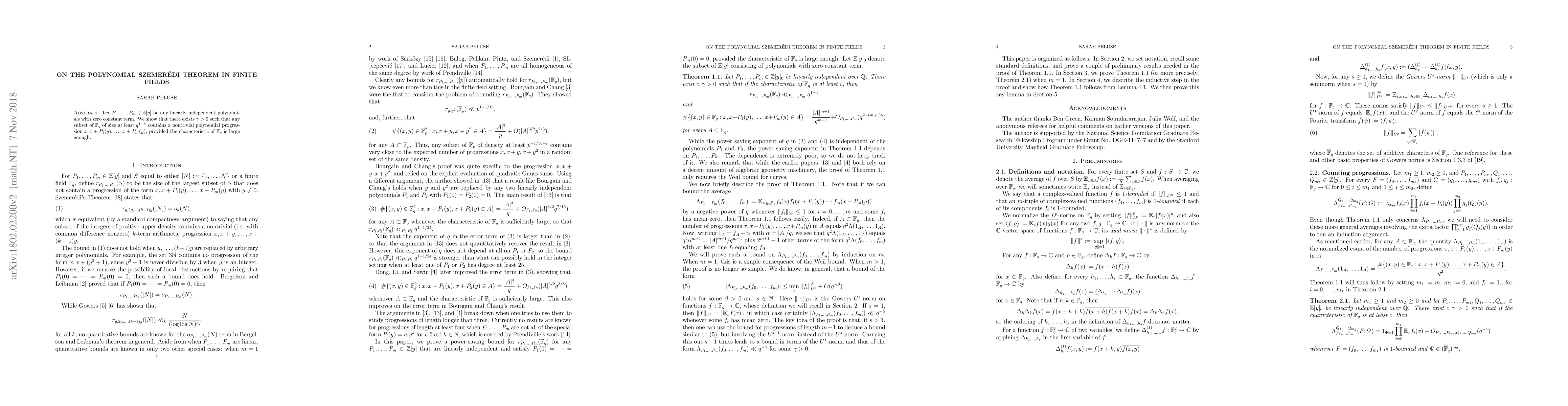 Let $P_1,\dots,P_m\in\mathbb{Z}[y]$ be any linearly independent polynomials with zero constant term. We show that there exists a $\gamma>0$ such that any subset of $\mathbb{F}_q$ of size at least $q^{1-\gamma}$ contains a nontrivial polynomial progression $x,x+P_1(y),\dots,x+P_m(y)$, provided the characteristic of $\mathbb{F}_q$ is large enough.