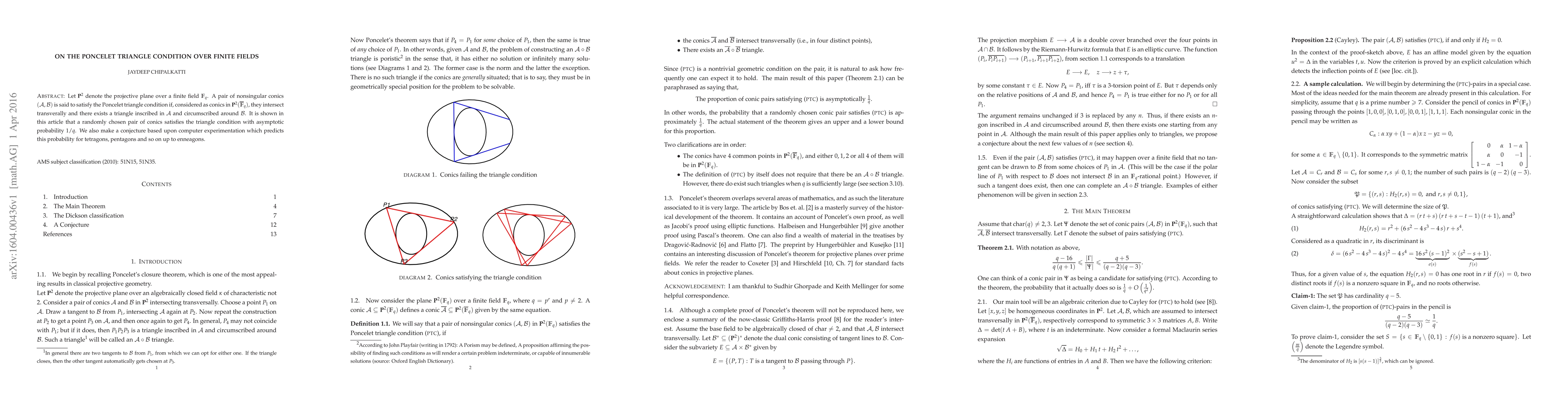 This paper investigates the Poncelet triangle condition for pairs of conics in the projective plane over a finite field, showing that randomly chosen pairs satisfy this condition with asymptotic probability $1/q$. The authors also propose a conjecture extending this probability to higher polygons up to enneagons based on computational evidence.