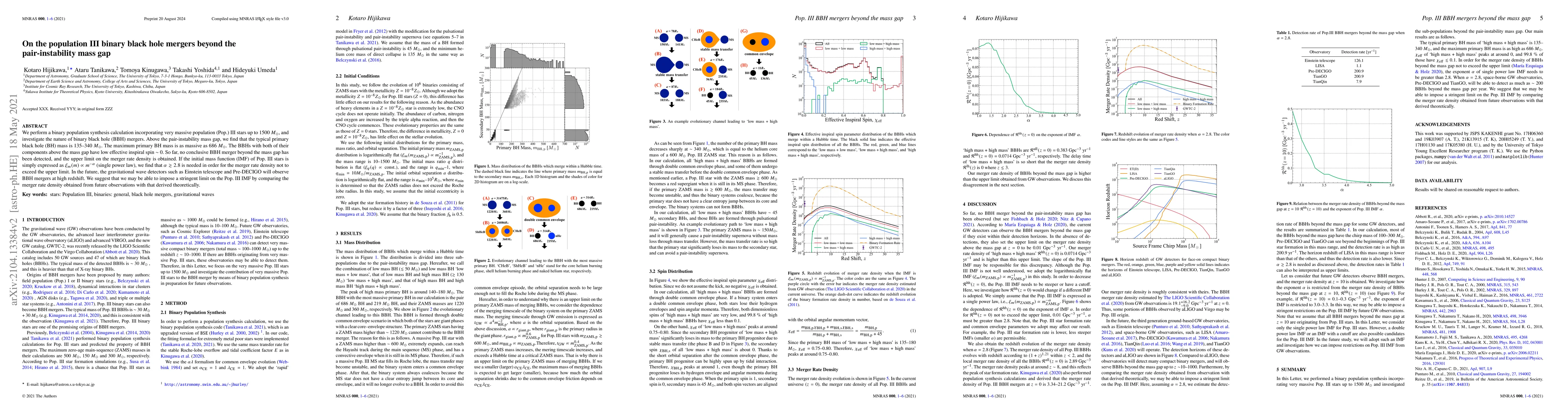 We perform a binary population synthesis calculation incorporating very massive population (Pop.) III stars up to 1500 $M_\odot$, and investigate the nature of binary black hole (BBH) mergers. Above the pair-instability mass gap, we find that the typical primary black hole (BH) mass is 135-340 $M_\odot$. The maximum primary BH mass is as massive as 686 $M_\odot$. The BBHs with both of their components above the mass gap have low effective inspiral spin $\sim$ 0. So far, no conclusive BBH merger beyond the mass gap has been detected, and the upper limit on the merger rate density is obtained. If the initial mass function (IMF) of Pop. III stars is simply expressed as $\xi_m(m) \propto m^{-\alpha}$ (single power law), we find that $\alpha \gtrsim 2.8$ is needed in order for the merger rate density not to exceed the upper limit. In the future, the gravitational wave detectors such as Einstein telescope and Pre-DECIGO will observe BBH mergers at high redshift. We suggest that we may be able to impose a stringent limit on the Pop. III IMF by comparing the merger rate density obtained from future observations with that derived theoretically.