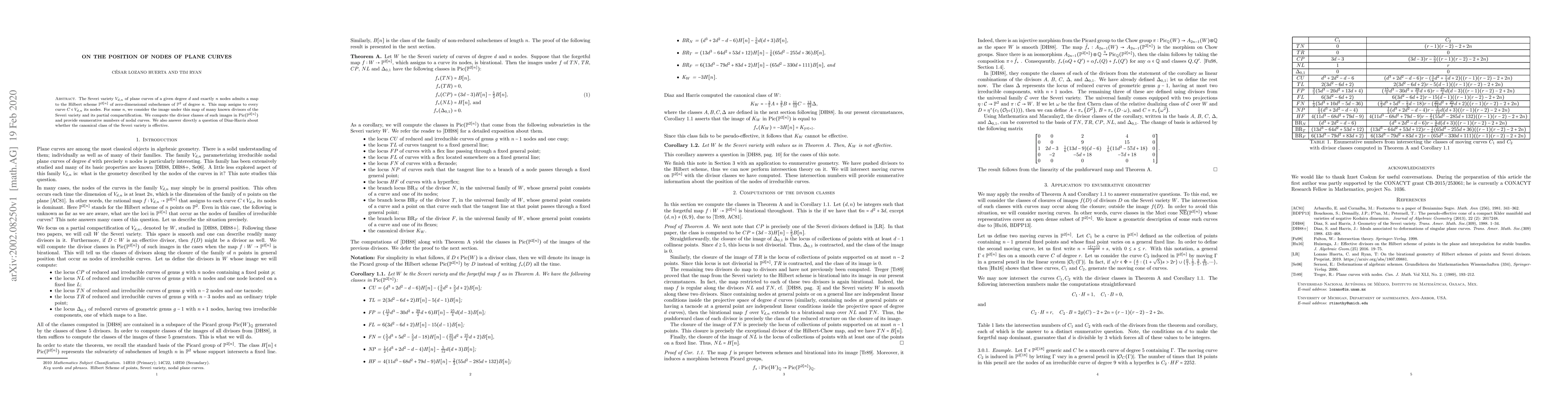 The Severi variety $V_{d,n}$ of plane curves of a given degree $d$ and exactly $n$ nodes admits a map to the Hilbert scheme $\mathbb{P}^{2[n]}$ of zero-dimensional subschemes of $\mathbb{P}^2$ of degree $n$. This map assigns to every curve $C\in V_{d,n}$ its nodes. For some $n$, we consider the image under this map of many known divisors of the Severi variety and its partial compactification. We compute the divisor classes of such images in Pic$(\mathbb{P}^{2[n]})$ and provide enumerative numbers of nodal curves. We also answer directly a question of Diaz-Harris about whether the canonical class of the Severi variety is effective.