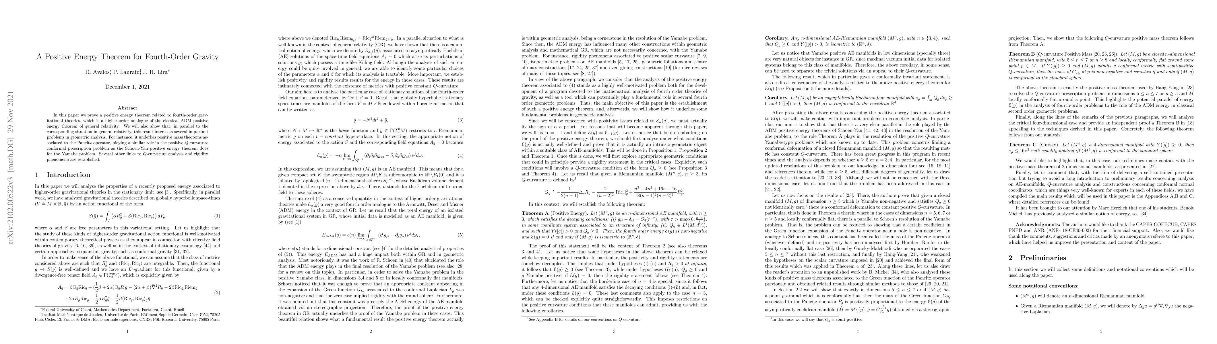 In this paper we prove a positive energy theorem related to fourth-order gravitational theories, which is a higher-order analogue of the classical ADM positive energy theorem of general relativity. We will also show that, in parallel to the corresponding situation in general relativity, this result intersects several important problems in geometric analysis. For instance, it underlies positive mass theorems associated to the Paneitz operator, playing a similar role in the positive $Q$-curvature conformal prescription problem as the Schoen-Yau positive energy theorem does for the Yamabe problem. Several other links to $Q$-curvature analysis and rigidity phenomena are established.