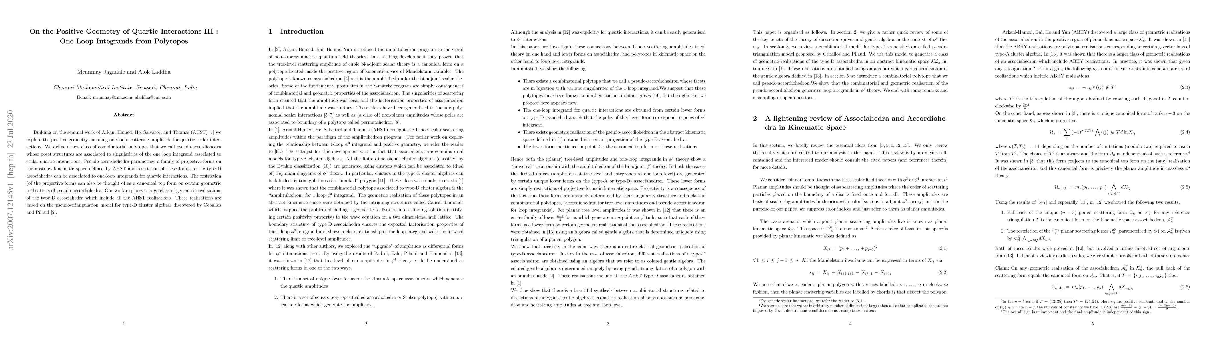 Building on the seminal work of Arkani-Hamed, He, Salvatori and Thomas (AHST), we explore the positive geometry encoding one loop scattering amplitude for quartic scalar interactions. We define a new class of combinatorial polytopes that we call pseudo-accordiohedra whose poset structures are associated to singularities of the one loop integrand associated to scalar quartic interactions. Pseudo-accordiohedra parametrize a family of projective forms on the abstract kinematic space defined by AHST and restriction of these forms to the type-D associahedra can be associated to one-loop integrands for quartic interactions. The restriction (of the projective form) can also be thought of as a canonical top form on certain geometric realisations of pseudo-accordiohedra. Our work explores a large class of geometric realisations of the type-D associahedra which include all the AHST realisations. These realisations are based on the pseudo-triangulation model for type-D cluster algebras discovered by Ceballos and Pilaud.