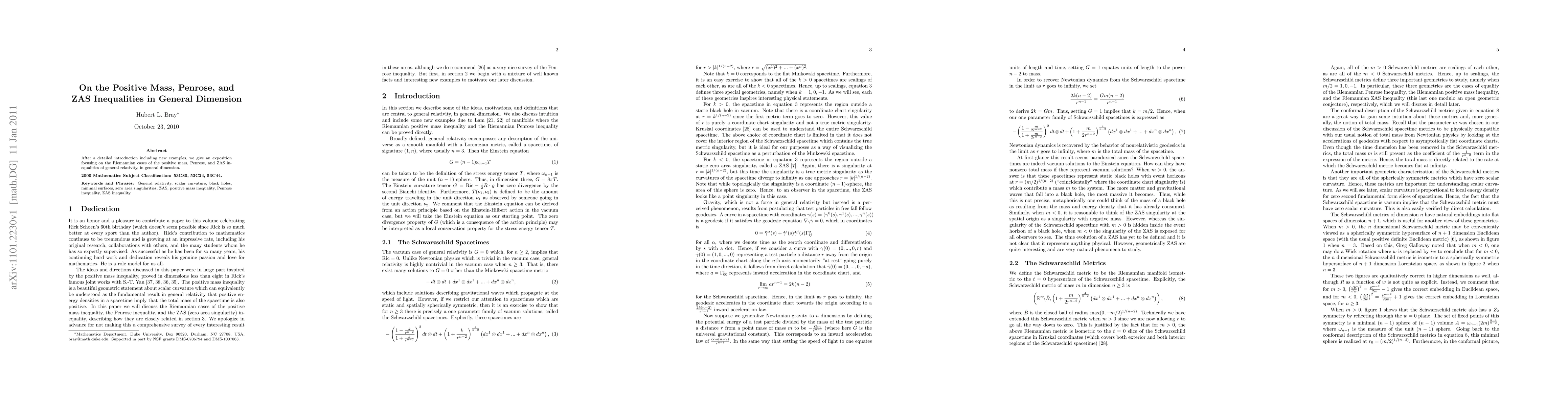 After a detailed introduction including new examples, we give an exposition focusing on the Riemannian cases of the positive mass, Penrose, and ZAS in- equalities of general relativity, in general dimension.