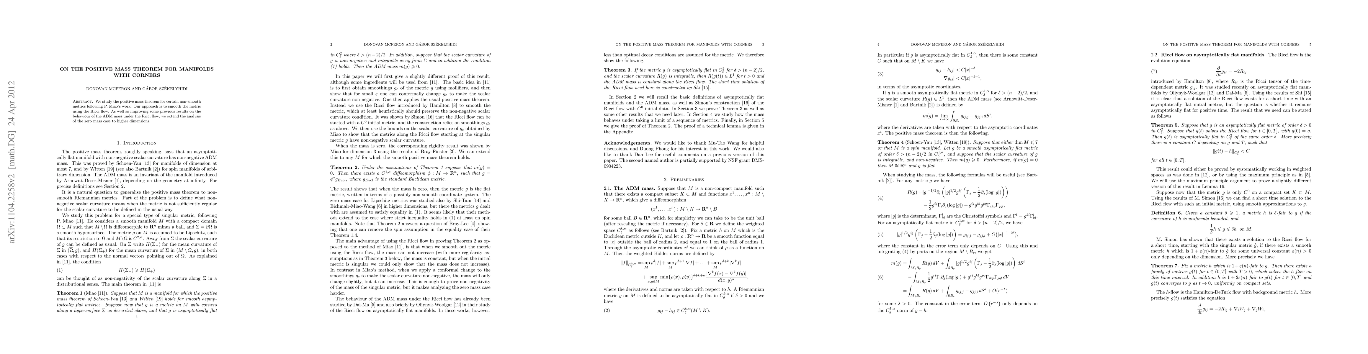 This paper extends the positive mass theorem to non-smooth metrics on manifolds with corners by smoothing the metric using Ricci flow and analyzing its behavior in higher dimensions.