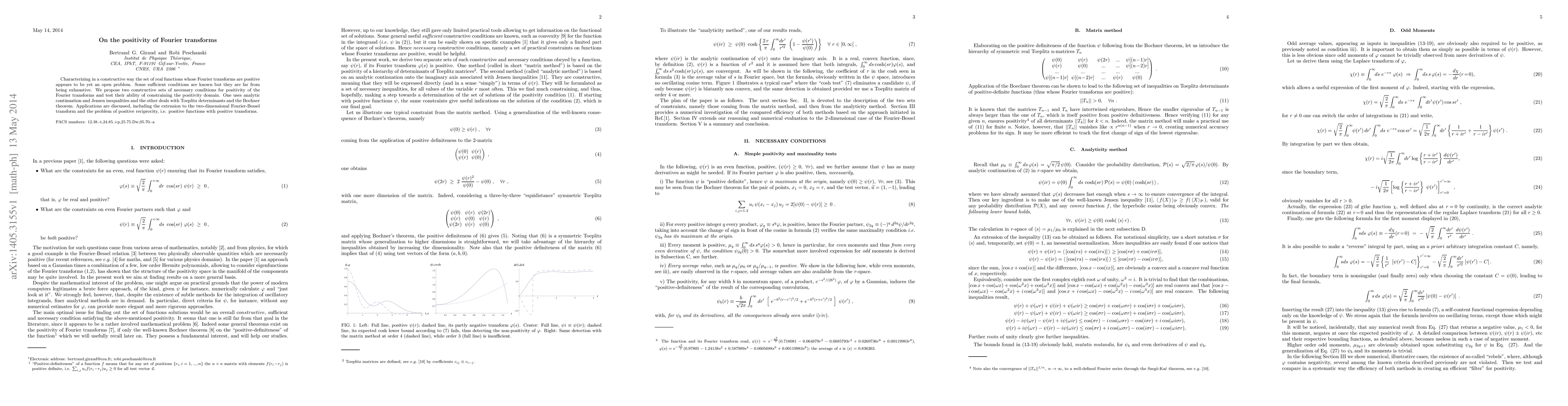 This paper proposes two necessary conditions for the positivity of Fourier transforms, utilizing analytic continuation and Jensen inequalities, and Toeplitz determinants with the Bochner theorem. It tests these conditions and explores their effectiveness in constraining the domain of positive Fourier transforms, with applications extending to two-dimensional Fourier-Bessel transforms and the positive reciprocity problem.