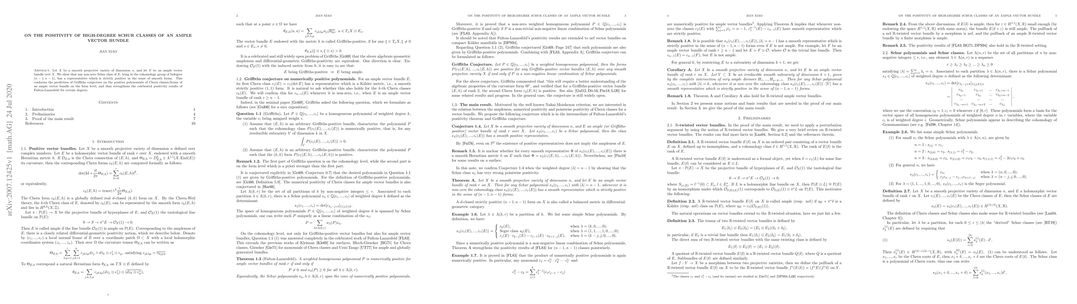 This research demonstrates that non-zero Schur classes of an ample vector bundle over a smooth projective variety, when residing in the cohomology group of bidegree $(n-1, n-1)$, possess strictly positive representatives in terms of smooth forms, thus supporting Griffiths conjecture and enhancing the positivity results of Fulton-Lazarsfeld.