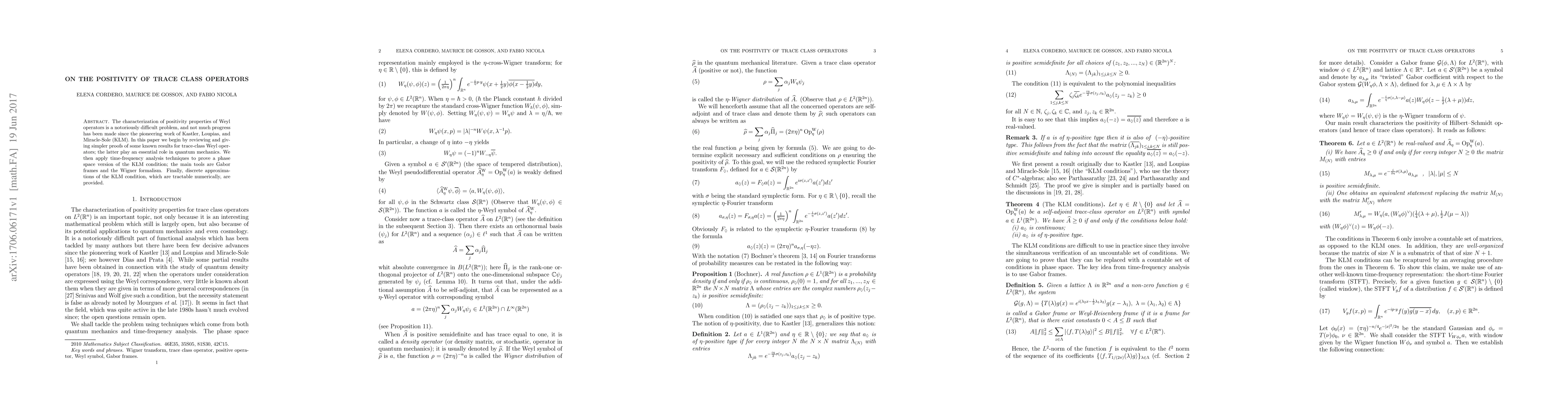 The characterization of positivity properties of Weyl operators is a notoriously difficult problem, and not much progress has been made since the pioneering work of Kastler, Loupias, and Miracle-Sole (KLM). In this paper we begin by reviewing and giving simpler proofs of some known results for trace-class Weyl operators; the latter play an essential role in quantum mechanics. We then apply time-frequency analysis techniques to prove a phase space version of the KLM condition; the main tools are Gabor frames and the Wigner formalism. Finally, discrete approximations of the KLM condition, which are tractable numerically, are provided.