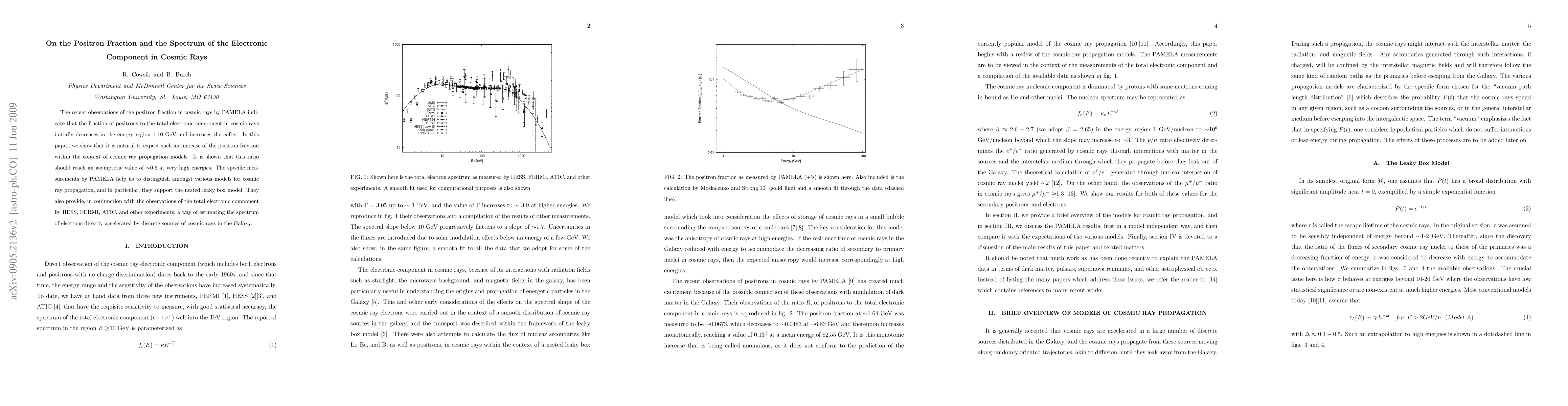 This paper analyzes the positron fraction in cosmic rays, noting its initial decrease and subsequent increase in the energy range 1-10 GeV, as observed by PAMELA. It concludes that such behavior is consistent with cosmic ray propagation models, particularly supporting the nested leaky box model, and estimates the spectrum of electrons from discrete cosmic ray sources.