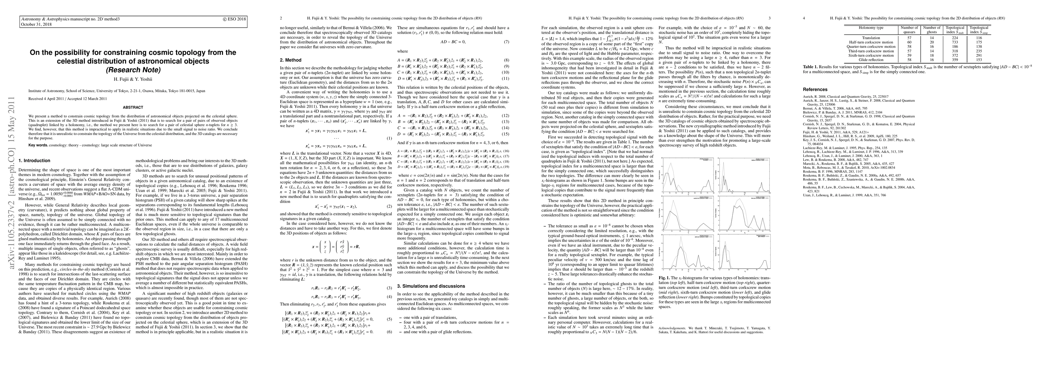 We present a method to constrain cosmic topology from the distribution of astronomical objects projected on the celestial sphere. This is an extension of the 3D method introduced in Fujii & Yoshii (2011) that is to search for a pair of pairs of observed objects (quadruplet) linked by a holonomy, i.e., the method we present here is to search for a pair of celestial sphere $n$-tuplets for $n \geq 3$. We find, however, that this method is impractical to apply in realistic situations due to the small signal to noise ratio. We conclude therefore that it is unrealistic to constrain the topology of the Universe from the celestial distribution, and the 3D catalogs are necessary for the purpose.