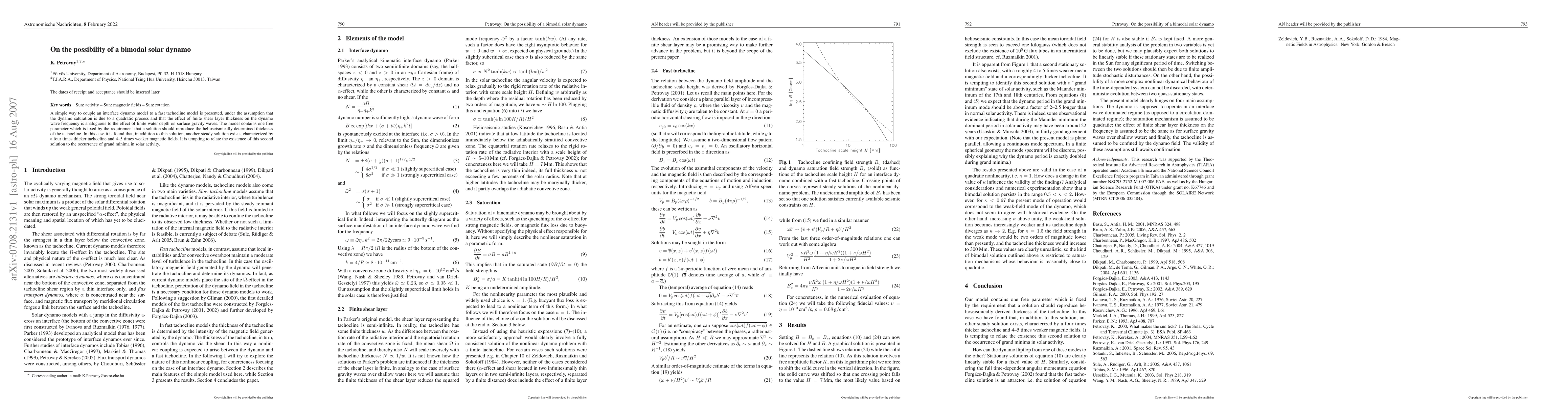 A simple way to couple an interface dynamo model to a fast tachocline model is presented, under the assumption that the dynamo saturation is due to a quadratic process and that the effect of finite shear layer thickness on the dynamo wave frequency is analoguous to the effect of finite water depth on surface gravity waves. The model contains one free parameter which is fixed by the requirement that a solution should reproduce the helioseismically determined thickness of the tachocline. In this case it is found that, in addition to this solution, another steady solution exists, characterized by a four times thicker tachocline and 4-5 times weaker magnetic fields. It is tempting to relate the existence of this second solution to the occurrence of grand minima in solar activity.