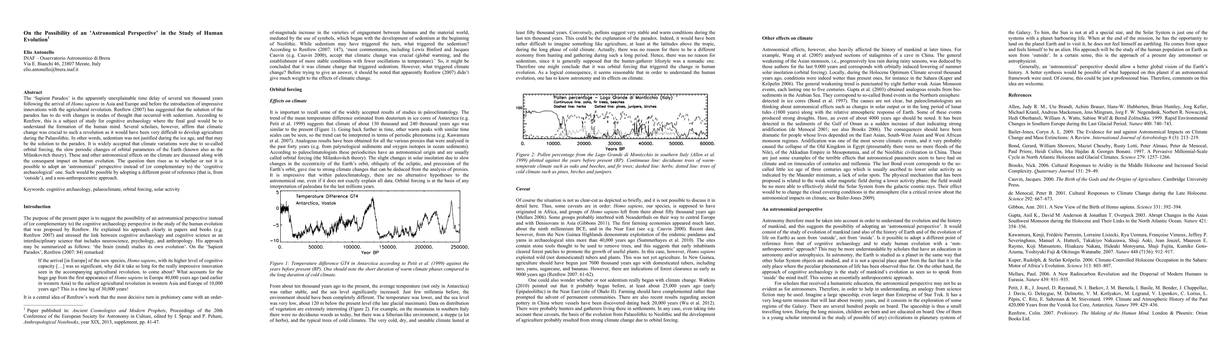 The Sapient Paradox is the apparently unexplainable time delay of several ten thousand years following the arrival of Homo sapiens in Asia and Europe and before the introduction of impressive innovations with the agricultural revolution. Renfrew (2007) has suggested that the solution of the paradox has to do with changes in modes of thought that occurred with sedentism. According to Renfrew, this is a subject of study for cognitive archaeology where the final goal would be to understand the formation of the human mind. Several scholars, however, affirm that climatic change was crucial to such a revolution as it would have been very difficult to develop agriculture during the Palaeolithic. In other words, sedentism was not justified during the ice age, and that may be the solution to the paradox. It is widely accepted that climate variations were due to so-called orbital forcing, the slow periodic changes of orbital parameters of the Earth (known also as the Milankovitch theory). These and other astronomical effects on the climate are discussed along with the consequent impact on human evolution. The question then rises as to whether or not it is possible to adopt an astronomical perspective instead of (or complementary to) the cognitive archaeological one. Such would be possible by adopting a different point of reference (that is, from outside), and a non-anthropocentric approach.