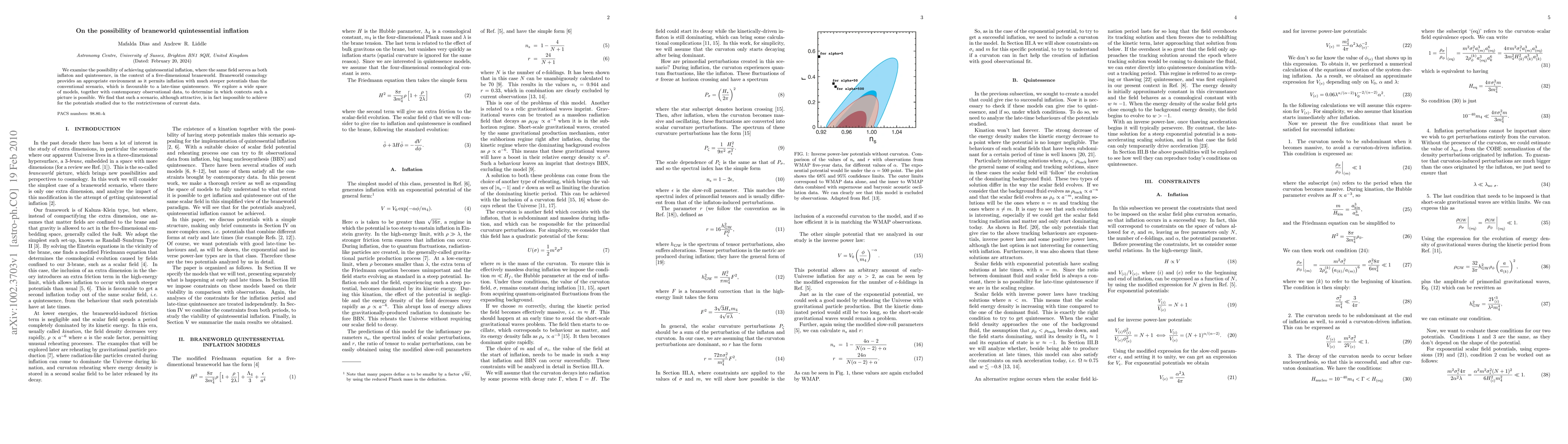 This paper investigates the feasibility of quintessential inflation in a five-dimensional braneworld setting, where the same field drives both inflation and late-time cosmic acceleration. Despite the braneworld's potential for steeper inflationary potentials, current observational data restricts the possibility of such a scenario.