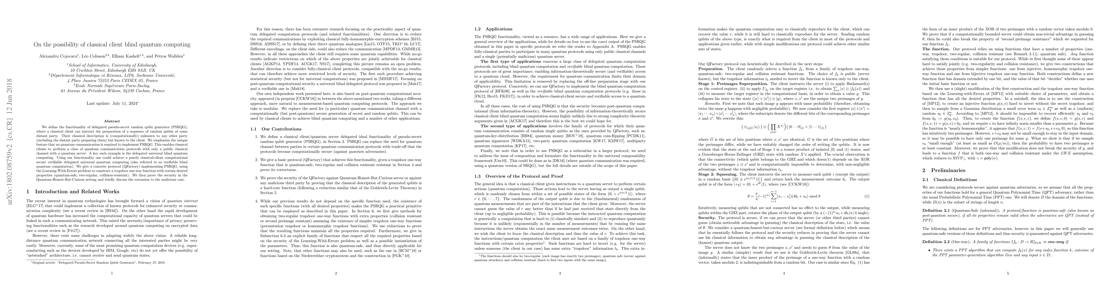 This paper proposes a delegated pseudo-secret random qubit generator (PSRQG) allowing classical clients to prepare random qubits without quantum communication, enabling secure verifiable delegated universal quantum computing. The QFactory protocol uses the Learning-With-Errors problem to achieve this, demonstrating security in the Quantum-Honest-But-Curious setting and discussing potential extensions to malicious scenarios.