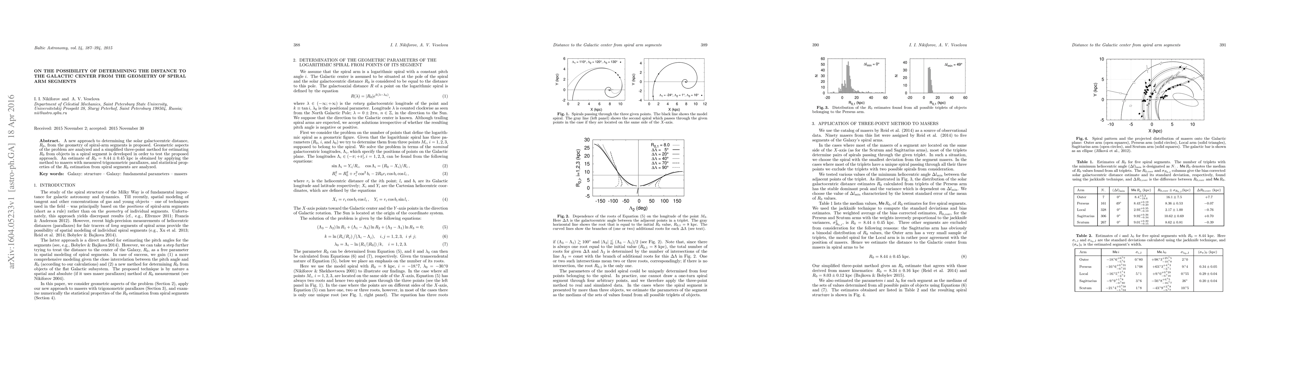 This paper proposes a new method to estimate the solar galactocentric distance, $R_0$, using the geometry of spiral arm segments, developing a simplified three-point approach. The method yields an estimate of $R_0 = 8.44 \pm 0.45$ kpc, validated through masers with trigonometric parallaxes.