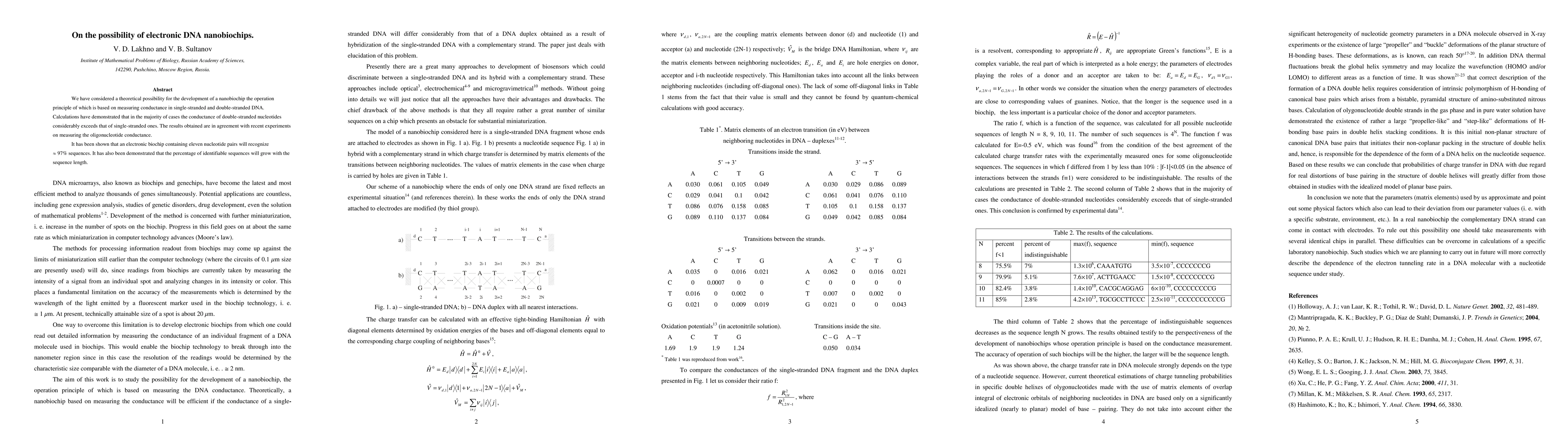 We have considered as a theoretical possibility for the development of a nanobiochip the operation principle of which is based on measuring conductance in single-stranded and double-stranded DNA. Calculations have demonstrated that in the majority of cases the conductance of double-stranded nucleotides considerably exceeds that of single-stranded ones. The results obtained are in agreement with recent experiments on measuring the oligonucleotide conductance. It has been shown that an electronic biochip containing 11 nucleotide pairs will recognize approximately 97% sequences. It has also been demonstrated that the percentage of identifiable sequences will grow with the sequence length.