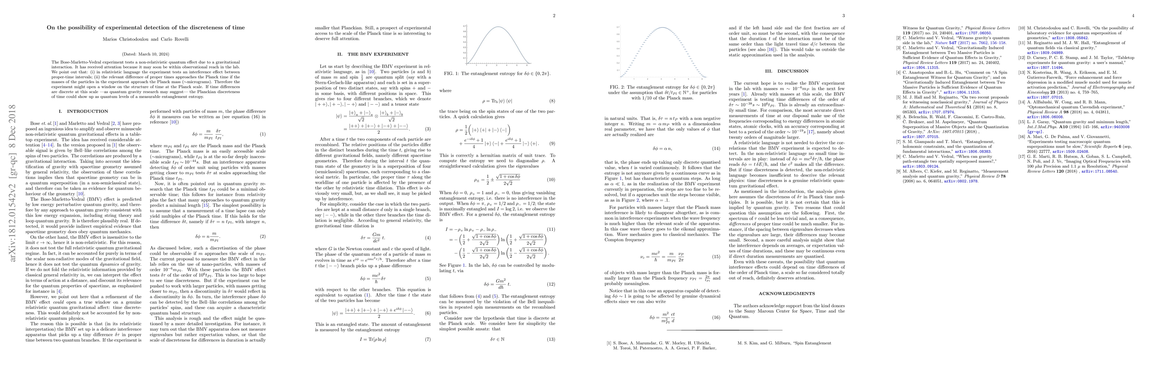The Bose-Marletto-Vedral experiment may soon detect the discreteness of time at the Planck scale, suggesting that time differences could appear as quantum levels of measurable entanglement entropy, with relevant proper-time differences being of the order of the Planck time when particles have masses similar to the Planck mass.