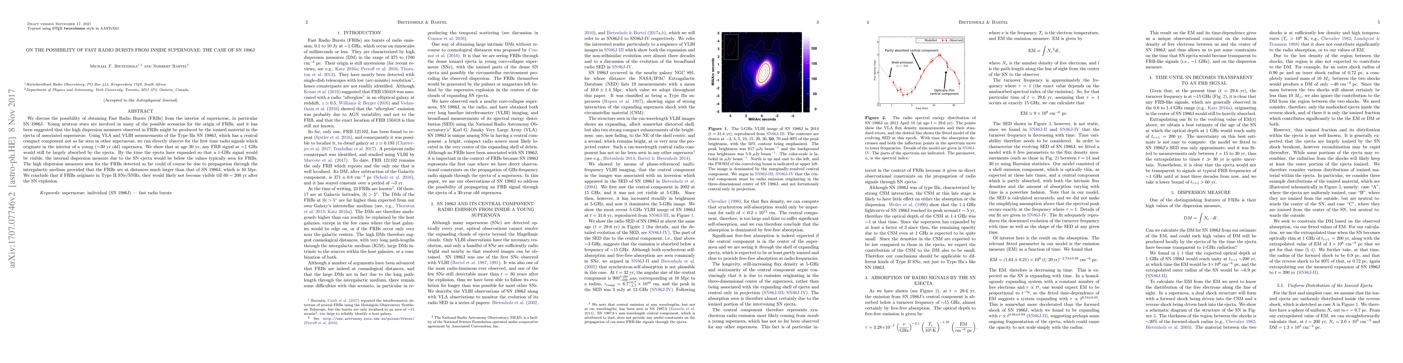 We discuss the possibility of obtaining Fast Radio Bursts (FRBs) from the interior of supernovae, in particular SN 1986J. Young neutron stars are involved in many of the possible scenarios for the origin of FRBs, and it has been suggested that the high dispersion measures observed in FRBs might be produced by the ionized material in the ejecta of associated supernovae. Using VLA and VLBI measurements of the Type IIn SN 1986J, which has a central compact component not so far seen in other supernovae, we can directly observe for the first time radio signals which originate in the interior of a young (~30 yr old) supernova. We show that at age 30 yr, any FRB signal at ~1 GHz would still be largely absorbed by the ejecta. By the time the ejecta have expanded so that a 1-GHz signal would be visible, the internal dispersion measure due to the SN ejecta would be below the values typically seen for FRBs. The high dispersion measures seen for the FRBs detected so far could of course be due to propagation through the intergalactic medium provided that the FRBs are at distances much larger than that of SN 1986J, which is 10 Mpc. We conclude that if FRBs originate in Type II SNe/SNRs, they would likely not become visible till 60 ~ 200 yr after the SN explosion.