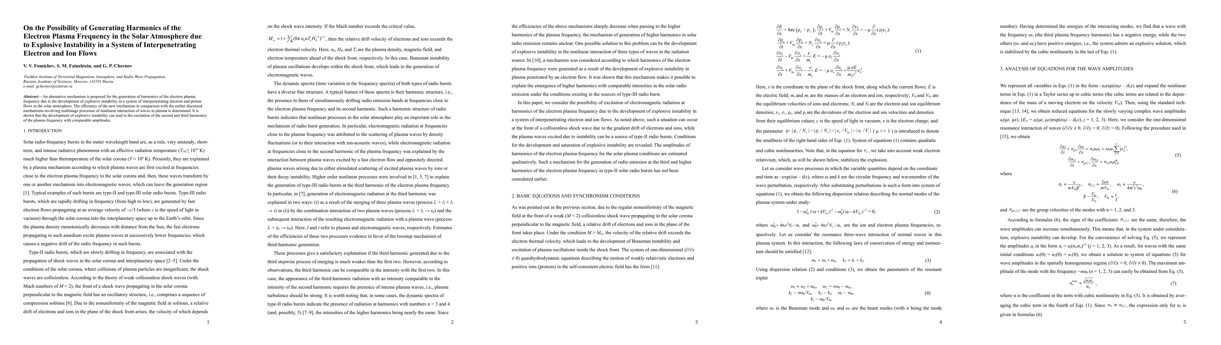 An alternative mechanism is proposed for the generation of harmonics of the electron plasma frequency due to the development of explosive instability in a system of interpenetrating electron and proton flows in the solar atmosphere. The efficiency of the new mechanism in comparison with the earlier discussed mechanisms involving multistage processes of nonlinear interaction of waves in plasma is determined. It is shown that the development of explosive instability can lead to the excitation of the second and third harmonics of the plasma frequency with comparable amplitudes.