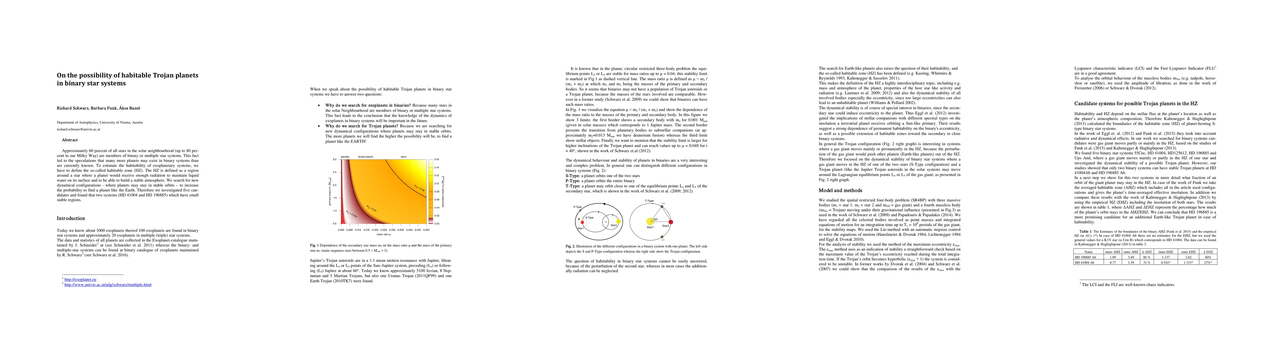 Approximately 60 percent of all stars in the solar neighbourhood (up to 80 percent in our Milky Way) are members of binary or multiple star systems. This fact led to the speculations that many more planets may exist in binary systems than are currently known. To estimate the habitability of exoplanetary systems, we have to define the so-called habitable zone (HZ). The HZ is defined as a region around a star where a planet would receive enough radiation to maintain liquid water on its surface and to be able to build a stable atmosphere. We search for new dynamical configurations - where planets may stay in stable orbits - to increase the probability to find a planet like the Earth. Therefore we investigated five candidates and found that two systems (HD 41004 and HD 196885) which have small stable regions.