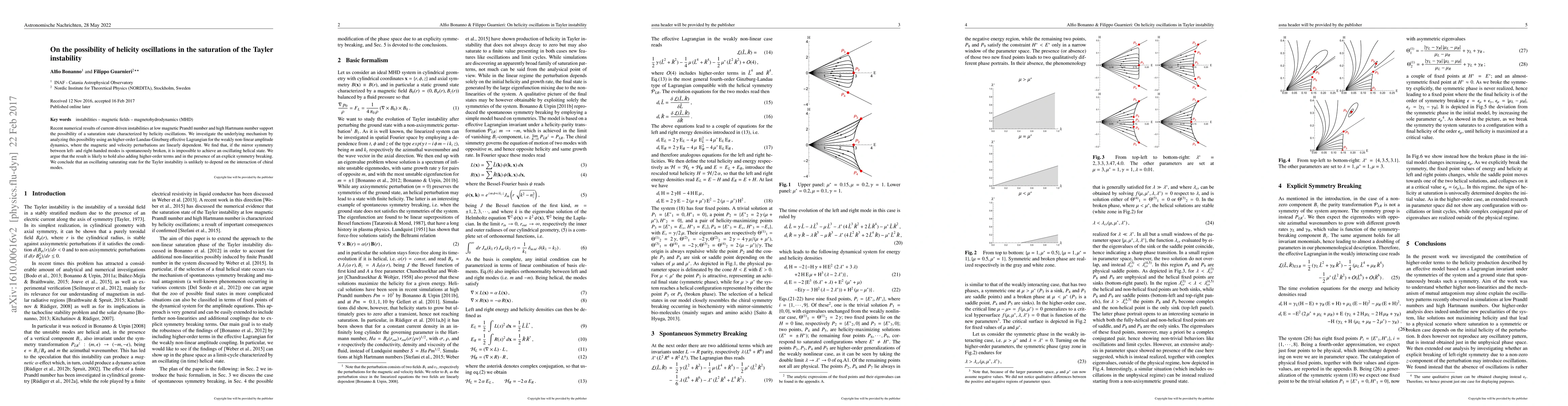 Recent numerical results of current-driven instabilities at low magnetic Prandtl number and high Hartmann number support the possibility of a saturation state characterized by helicity oscillations. We investigate the underlying mechanism by analyzing this possibility using an higher-order Landau-Ginzburg effective Lagrangian for the weakly non-linear amplitude dynamics, where the magnetic and velocity perturbations are linearly dependent. We find that, if the mirror symmetry between left- and right-handed modes is spontaneously broken, it is impossible to achieve an oscillating helical state. We argue that the result is likely to hold also adding higher-order terms and in the presence of an explicit symmetry breaking. We conclude that an oscillating saturating state for the Tayler instability is unlikely to depend on the interaction of chiral modes.