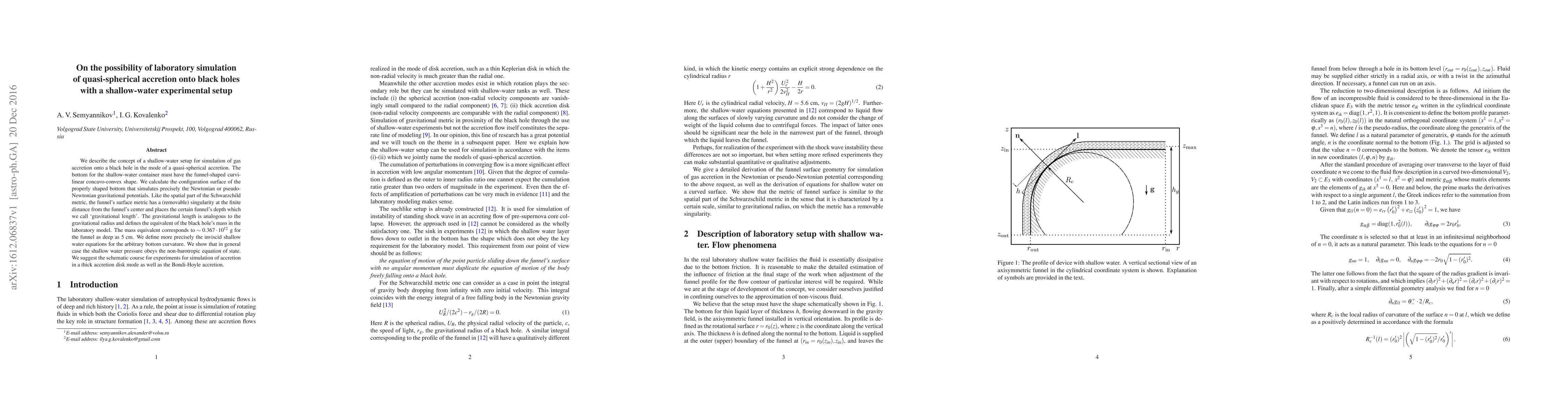 We describe the concept of a shallow-water setup for simulation of gas accretion onto a black hole in the mode of a quasi-spherical accretion. The bottom for the shallow-water container must have the funnel-shaped curvilinear concavo-convex shape. We calculate the configuration surface of the properly shaped bottom that simulates precisely the Newtonian or pseudo-Newtonian gravitational potentials. Like the spatial part of the Schwarzchild metric, the funnel's surface metric has a (removable) singularity at the finite distance from the funnel's center and places the certain funnel's depth which we call `gravitational length'. The gravitational length is analogous to the gravitational radius and defines the equivalent of the black hole's mass in the laboratory model. The mass equivalent corresponds to $\sim 0.367\cdot 10^{12}$ g for the funnel as deep as 5 cm. We define more precisely the inviscid shallow water equations for the arbitrary bottom curvature. We show that in general case the shallow water pressure obeys the non-barotropic equation of state. We suggest the schematic course for experiments for simulation of accretion in a thick accretion disk mode as well as the Bondi-Hoyle accretion.