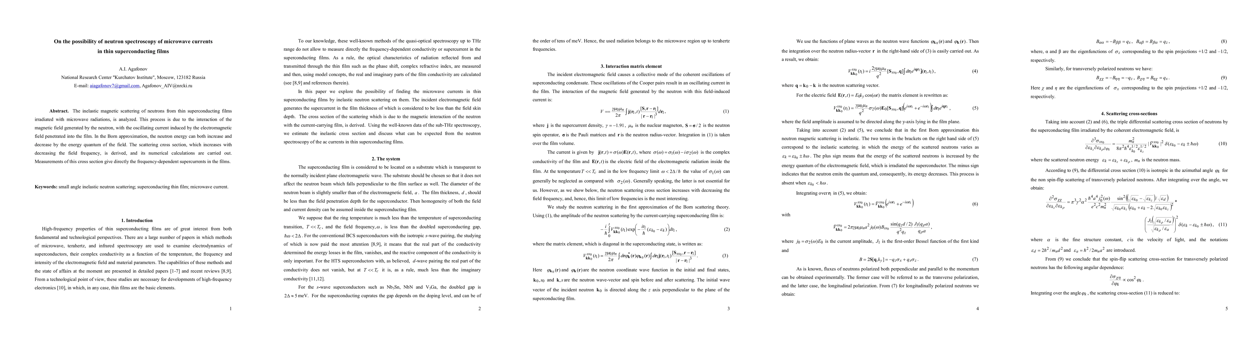The inelastic magnetic scattering of neutrons from thin superconducting films irradiated with microwave radiations, is analyzed. This process is due to the interaction of the magnetic field generated by the neutron, with the oscillating current induced by the electromagnetic field penetrated into the film. In the Born approximation, the neutron energy can both increase and decrease by the energy quantum of the field. The scattering cross section, which increases with decreasing the field frequency, is derived, and its numerical calculations are carried out. Measurements of this cross section give directly the frequency-dependent supercurrents in the films.