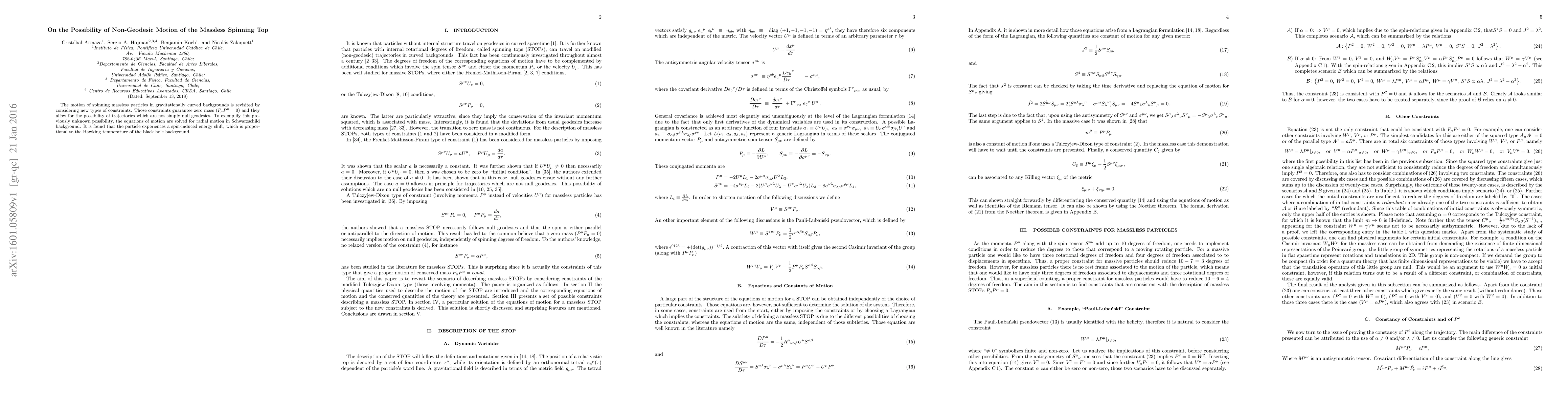 The motion of spinning massless particles in gravitationally curved backgrounds is revisited by considering new types of constraints. Those constraints guarantee zero mass ($P_\mu P^\mu=0$) and they allow for the possibility of trajectories which are not simply null geodesics. To exemplify this previously unknown possibility, the equations of motion are solved for radial motion in Schwarzschild background. It is found that the particle experiences a spin-induced energy shift, which is proportional to the Hawking temperature of the black hole background.