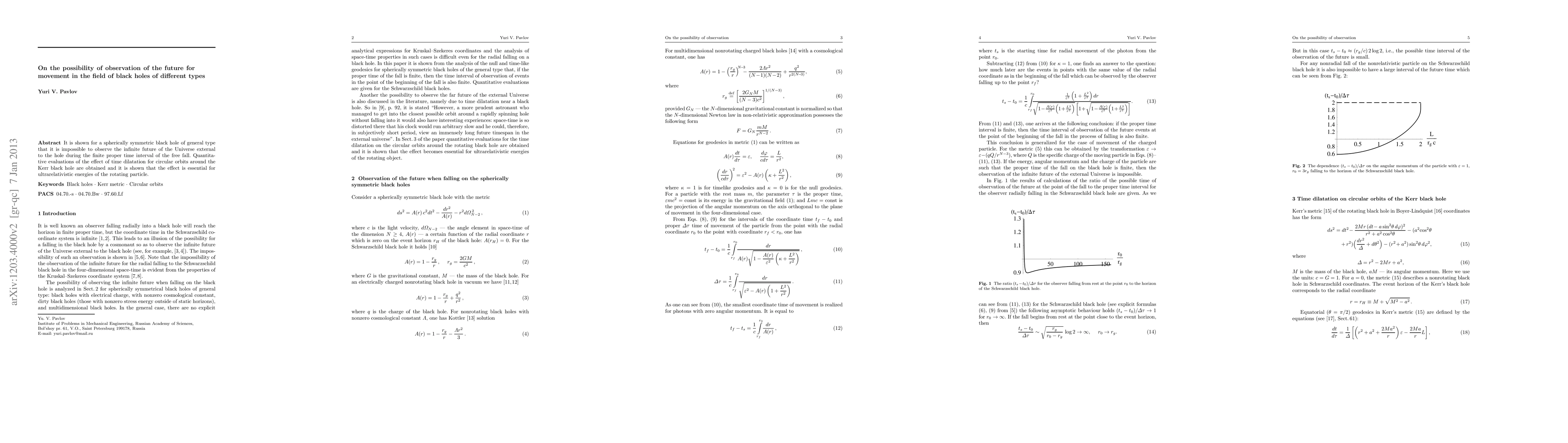 It is shown for a spherically symmetric black hole of general type that it is impossible to observe the infinite future of the Universe external to the hole during the finite proper time interval of the free fall. Quantitative evaluations of the effect of time dilatation for circular orbits around the Kerr black hole are obtained and it is shown that the effect is essential for ultrarelativistic energies of the rotating particle.