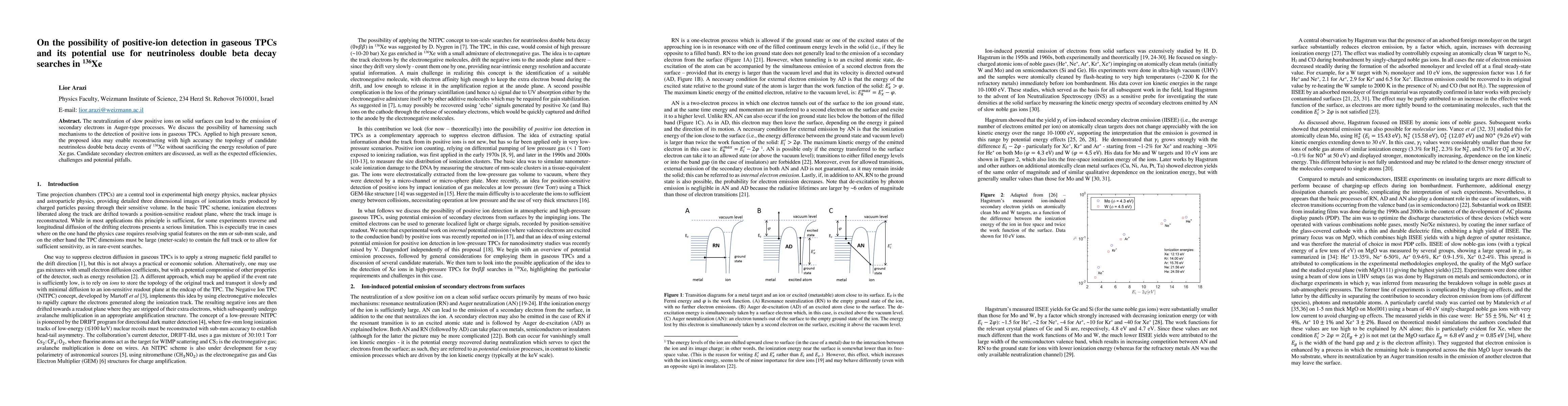 This paper explores the potential of detecting positive ions in gaseous Time Projection Chambers (TPCs) through Auger-type processes, which could enhance the detection of neutrinoless double beta decay in Xe-136. The study discusses candidate materials for secondary electron emission and evaluates the efficiency, challenges, and benefits of this approach.