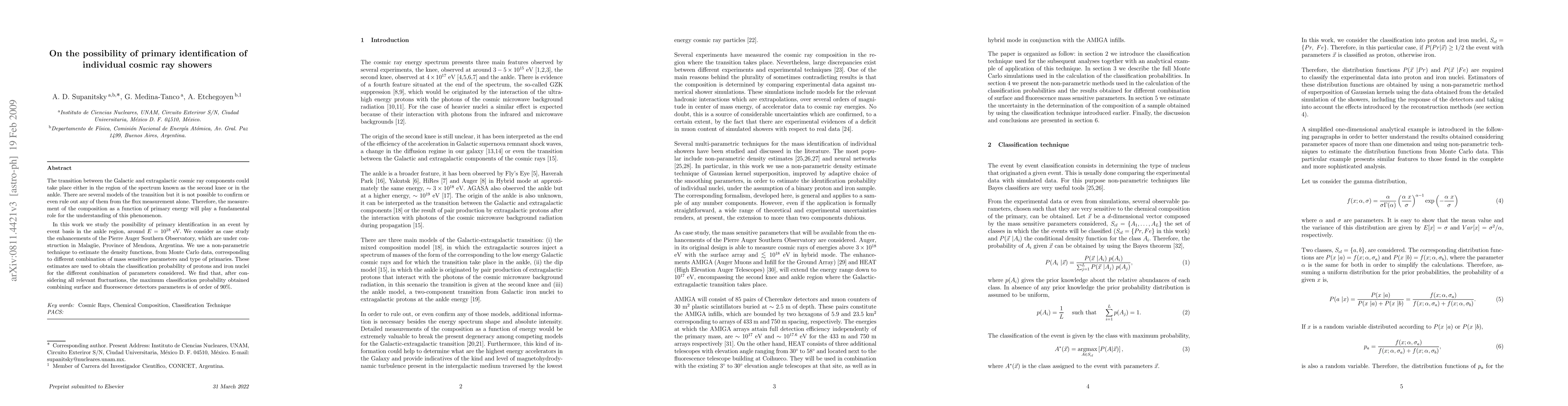 The transition between the Galactic and extragalactic cosmic ray components could take place either in the region of the spectrum known as the second knee or in the ankle. There are several models of the transition but it is not possible to confirm or even rule out any of them from the flux measurement alone. Therefore, the measurement of the composition as a function of primary energy will play a fundamental role for the understanding of this phenomenon. In this work we study the possibility of primary identification in an event by event basis in the ankle region, around $E = 10^{18}$ eV. We consider as case study the enhancements of the Pierre Auger Southern Observatory, which are under construction in Malague, Province of Mendoza, Argentina. We use a non-parametric technique to estimate the density functions, from Monte Carlo data, corresponding to different combination of mass sensitive parameters and type of primaries. These estimates are used to obtain the classification probability of protons and iron nuclei for the different combination of parameters considered. We find that, after considering all relevant fluctuations, the maximum classification probability obtained combining surface and fluorescence detectors parameters is of order of 90%.
