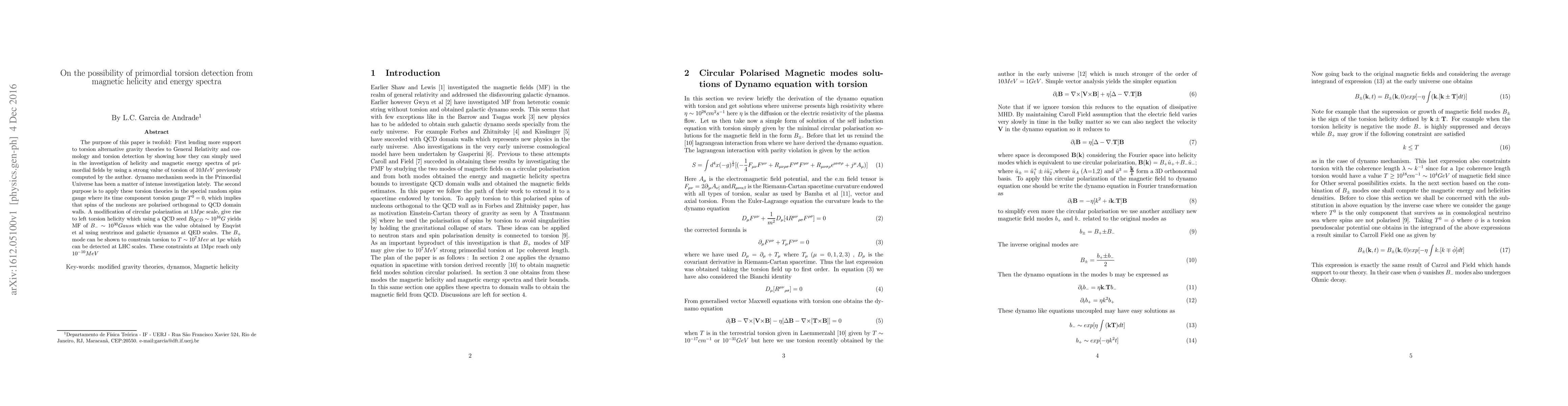 The purpose of this paper is twofold: First lending more support to torsion alternative gravity theories to General Relativity and cosmology and torsion detection by showing how they can simply used in the investigation of helicity and magnetic energy spectra of primordial fields by using a strong value of torsion of $10MeV$ previously computed by the author. dynamo mechanism seeds in the Primordial Universe has been a matter of intense investigation lately. The second purpose is to apply these torsion theories in the special random spins gauge where its time component torsion gauge $T^{0}=0$, which implies that spins of the nucleons are polarised orthogonal to QCD domain walls. A modification of circular polarization at $1Mpc$ scale, give rise to left torsion helicity which using a QCD seed $B_{QCD}\sim{10^{16}G}$ yields MF of $B_{-}\sim{10^{30}Gauss}$ which was the value obtained by Enqvist et al using neutrinos and galactic dynamos at QED scales. The $B_{+}$ mode can be shown to constrain torsion to $T\sim{10^{7}Mev}$ at $1pc$ which can be detected at LHC scales. These constraints at 1Mpc reach only $10^{-10}MeV$