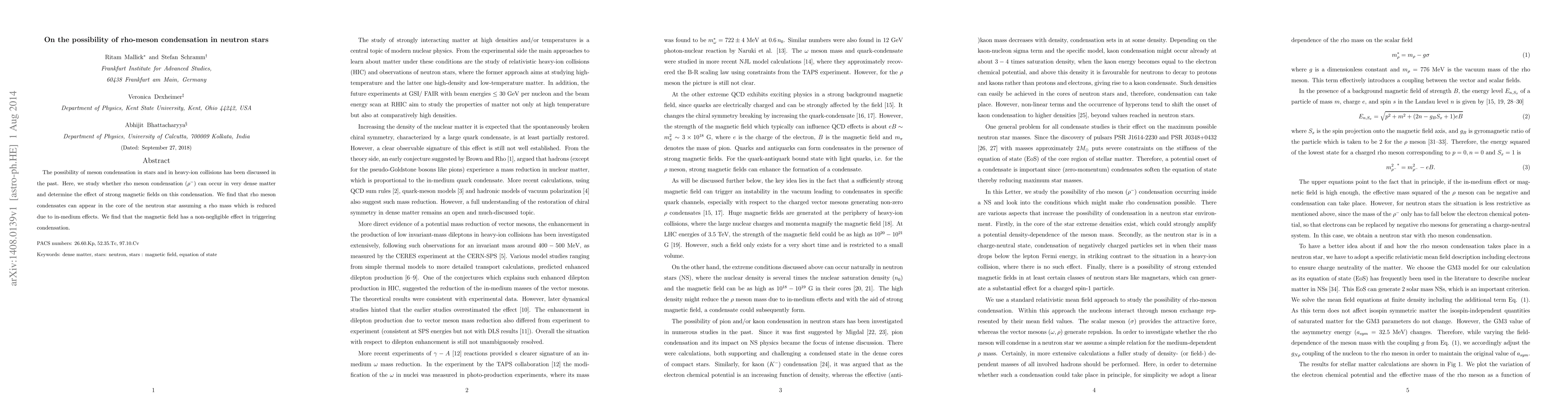 This paper investigates the potential for rho meson condensation in neutron stars, finding that such condensation can occur in the star's core under dense matter conditions, with strong magnetic fields playing a significant role in triggering this phenomenon.