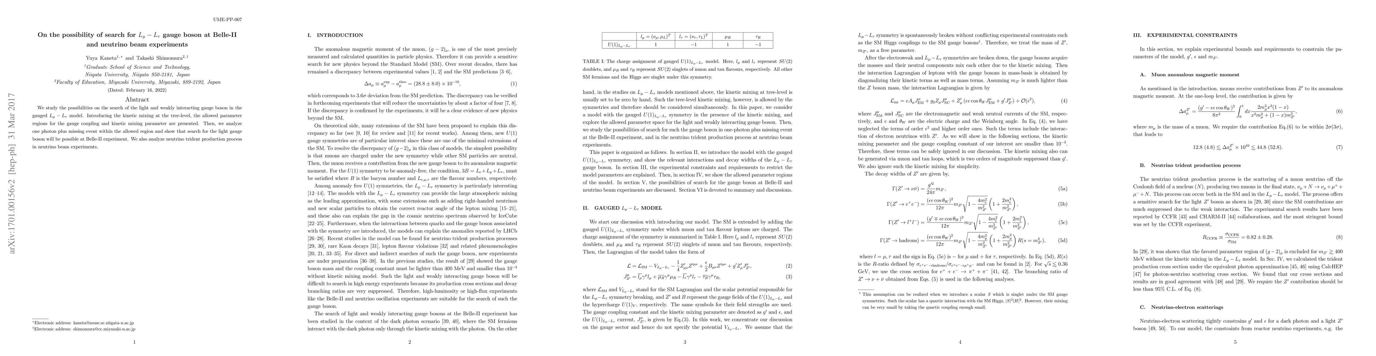 Researchers explored the possibility of detecting a hypothetical $L_ au - L_ au$ gauge boson at the Belle-II experiment and in neutrino beam experiments, finding it potentially detectable at Belle-II.
