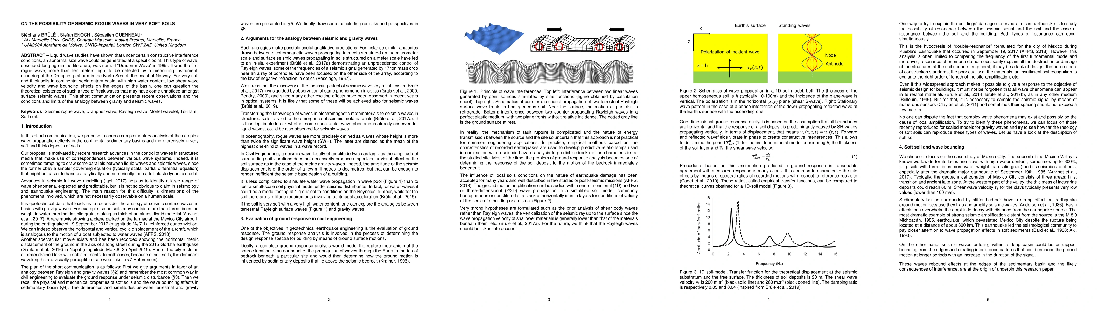 Liquid wave studies have shown that under certain constructive interference conditions, an abnormal size wave could be generated at a specific point. This type of wave, described long ago in the literature, was named 'Draupner Wave' in 1995. It was the first rogue wave, more than ten meters high, to be detected by a measuring instrument, occurring at the Draupner platform in the North Sea off the coast of Norway. For very soft and thick soils in continental sedimentary basin, with high water content, low shear wave velocity and wave bouncing effects on the edges of the basin, one can question the theoretical existence of such a type of freak waves that may have come unnoticed amongst surface seismic waves. This short communication presents recent observations and the conditions and limits of the analogy between gravity and seismic waves.