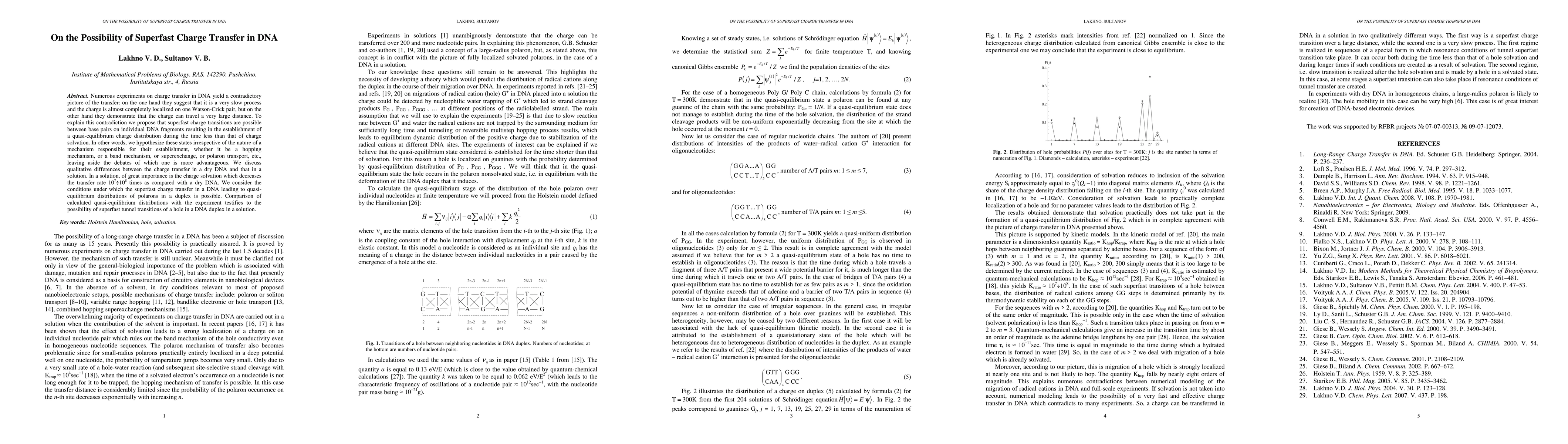 The research proposes a theory for superfast charge transitions in DNA, utilizing the Holstein model and canonical Gibbs ensemble to calculate quasi-equilibrium distributions of polarons in a duplex.