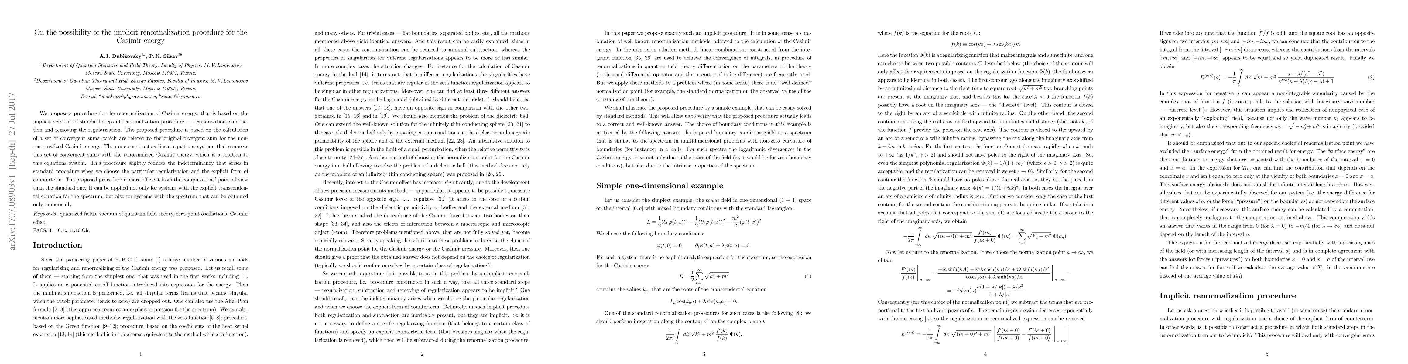 We propose a procedure for the renormalization of Casimir energy, that is based on the implicit versions of standard steps of renormalization procedure --- regularization, subtraction and removing the regularization. The proposed procedure is based on the calculation of a set of convergent sums, which are related to the original divergent sum for the non-renormalized Casimir energy. Then one constructs a linear equations system, that connects this set of convergent sums with the renormalized Casimir energy, which is a solution to this equations system. This procedure slightly reduces the indeterminancy that arises in standard procedure when we choose the particular regularization and the explicit form of counterterm. The proposed procedure is more efficient from the computational point of view than the standard one. It can be applied not only for systems with the explicit transcendental equation for the spectrum, but also for systems with the spectrum that can be obtained only numerically.